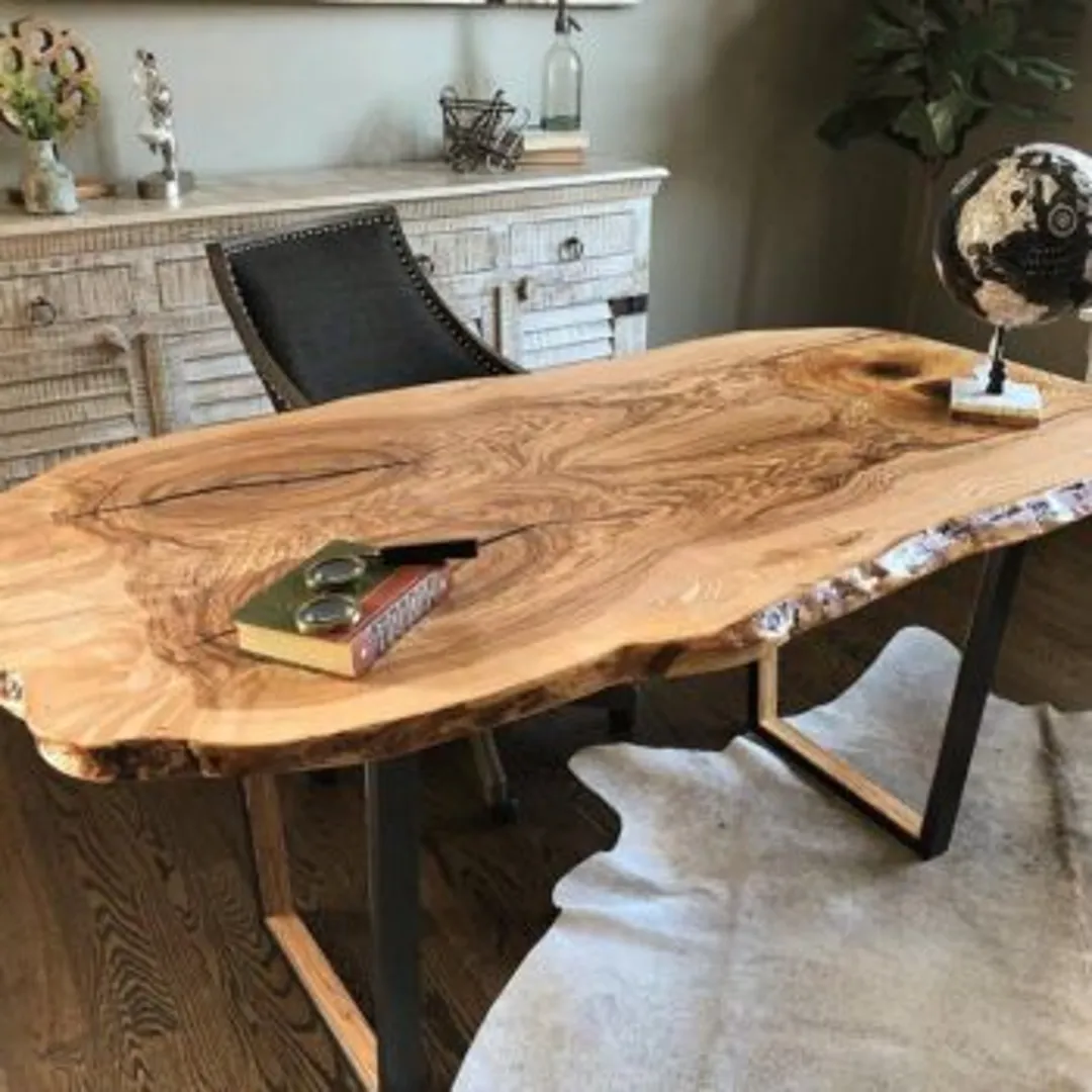 Древесина с живым срезом – другой вариант, способный добавить характерности дизайну офиса в деревенском стиле. Отдайте предпочтение литой железной фурнитуре по всему пространству изделия. Если вам подходит стул с обивкой, то выбирайте с контрастными железными кнопками по краям.