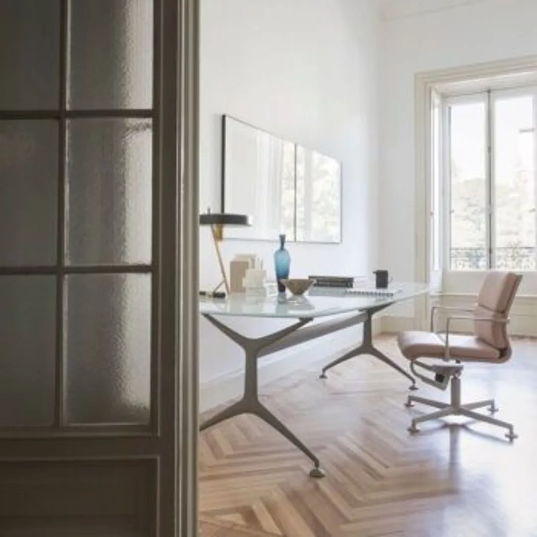 Стол, покрытый стеклом – отличная идея для домашнего офиса, особенно если вы хотите, чтобы комната выглядела как можно более просторнее и больше. Так как рабочий стол с поверхностью из стекла большей частью прозрачен, создается иллюзия, что он не такой громоздкий, как обычный.