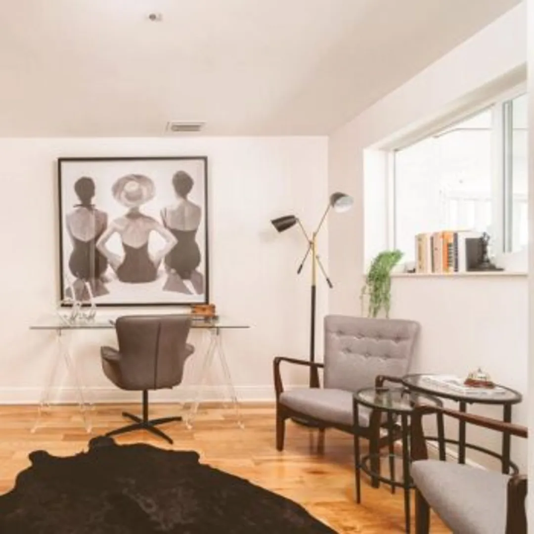 Если пространство позволяет, расположите еще один административный стол со шкафами для создания дополнительного рабочего пространства у задней стены. Если свободного места не так много, разместите декор домашнего кабинета вокруг. Это могут быть крупные предметы изобразительного искусства или гладкое зеркало позади кресла.