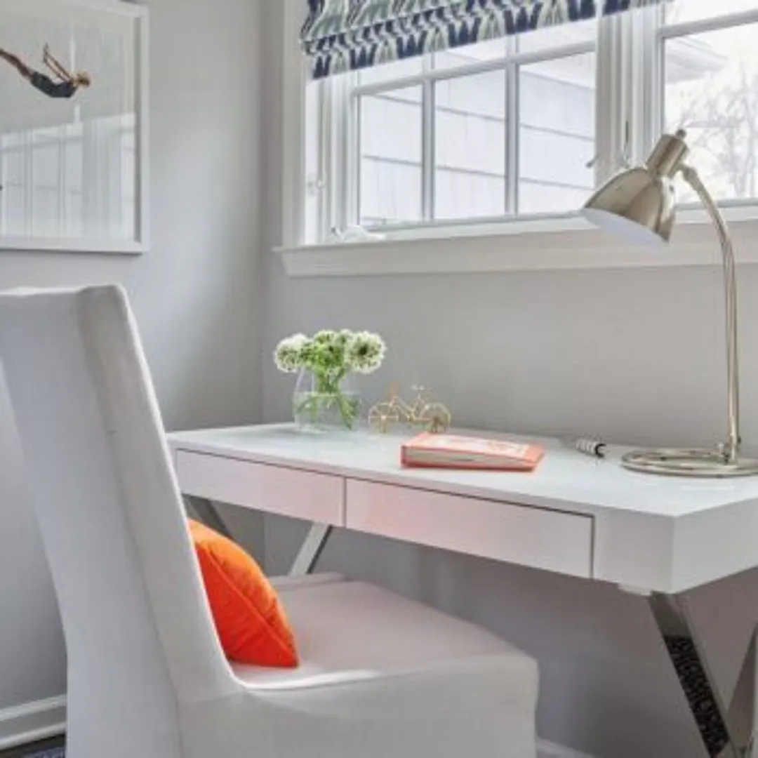 Серебряные акценты и нейтральные цвета придадут рабочему столу привлекательный современный вид. Любой стул со спинкой или скамья хорошо подойдут – и не бойтесь попробовать что-то, обладающее уникальной формой.