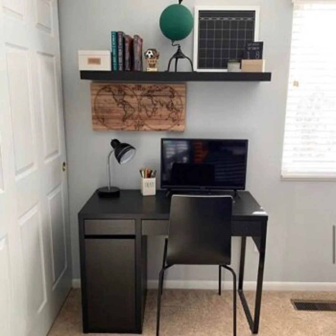 Организация – это ключ к содержанию пространства в минималистском стиле. Если возможно, выбирайте рабочий стол со встроенным выдвижным ящиком, предоставляющий дополнительное место для хранения. Навесной шкаф или доска с вешалками и креплениями помогут примириться с отсутствием дверей у шкафчика в нижней части стола.