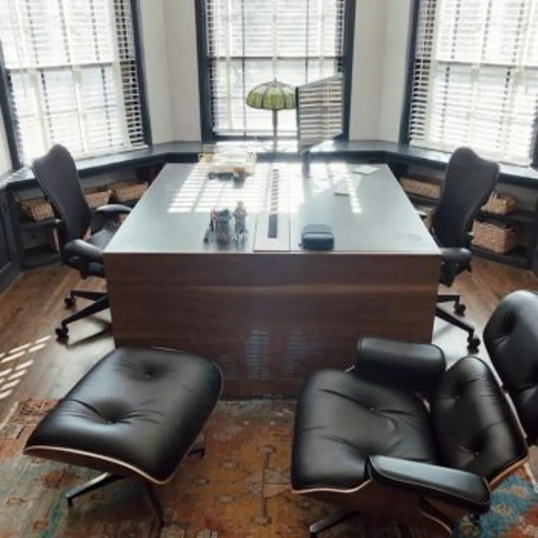 Чтобы придерживаться административного офисного стиля, разместите основной рабочий стол в центре комнаты. Оформите его одинаковыми шкафами, которые предоставят дополнительное место для хранения.