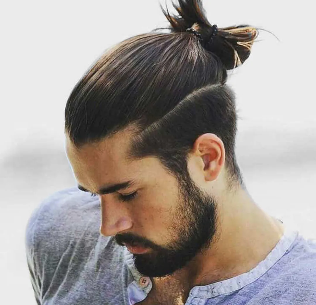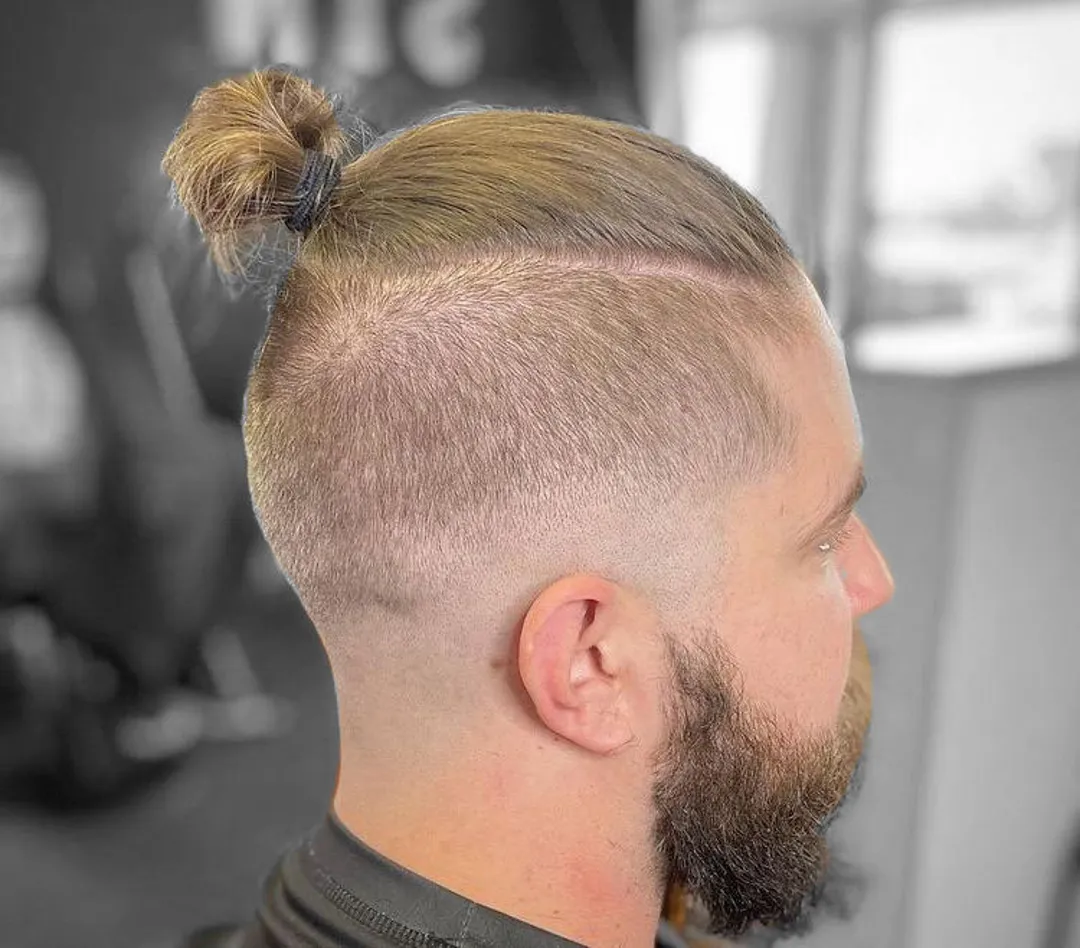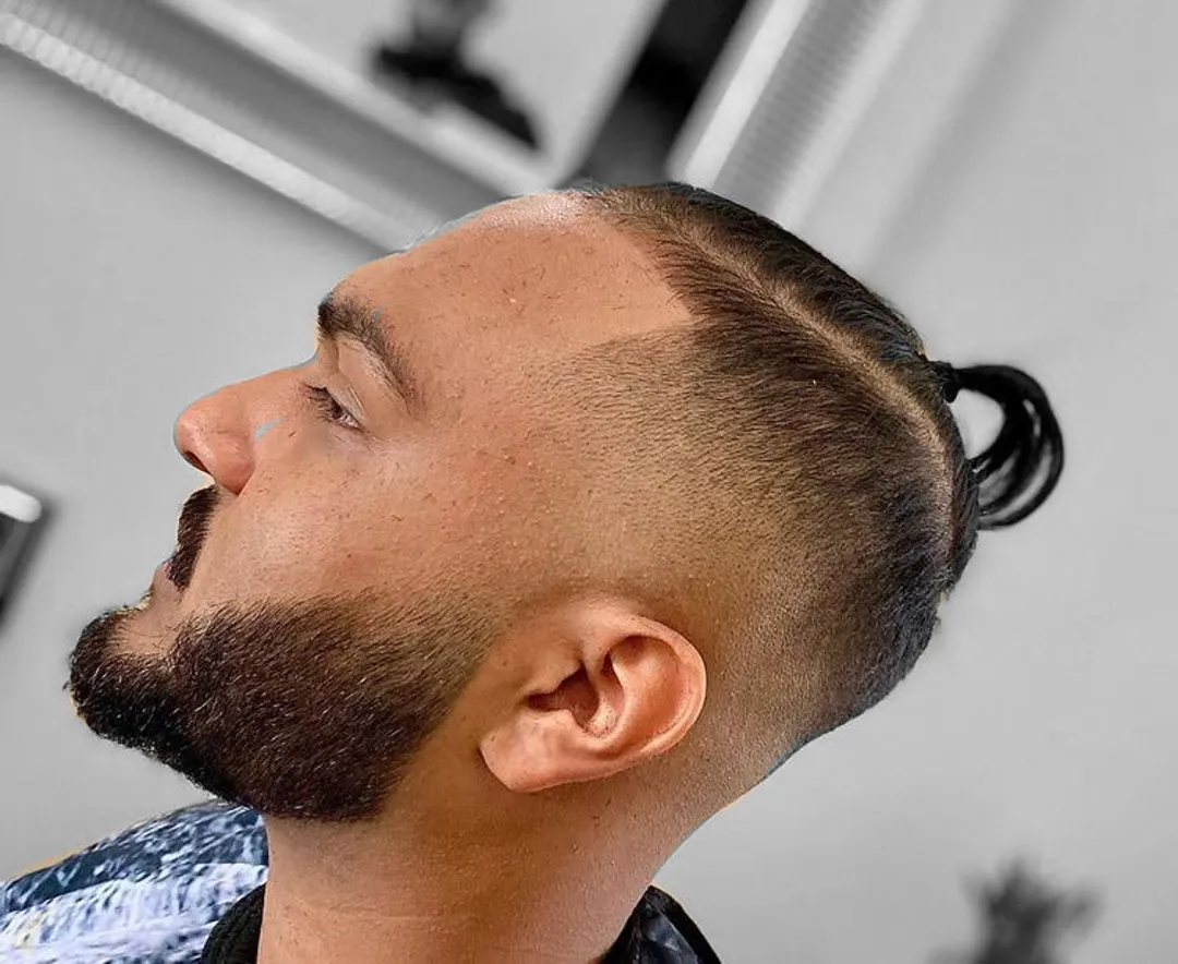 Затем причешите длинные волосы на макушке и закрепите их в пучок с помощью резинки для волос. Если вы хотите сделать высокий фейд не таким заметным, вы можете сочетать свой стиль со средней бородой. Однако, если вам нужен более аккуратный вид, вы можете сбрить бороду.
