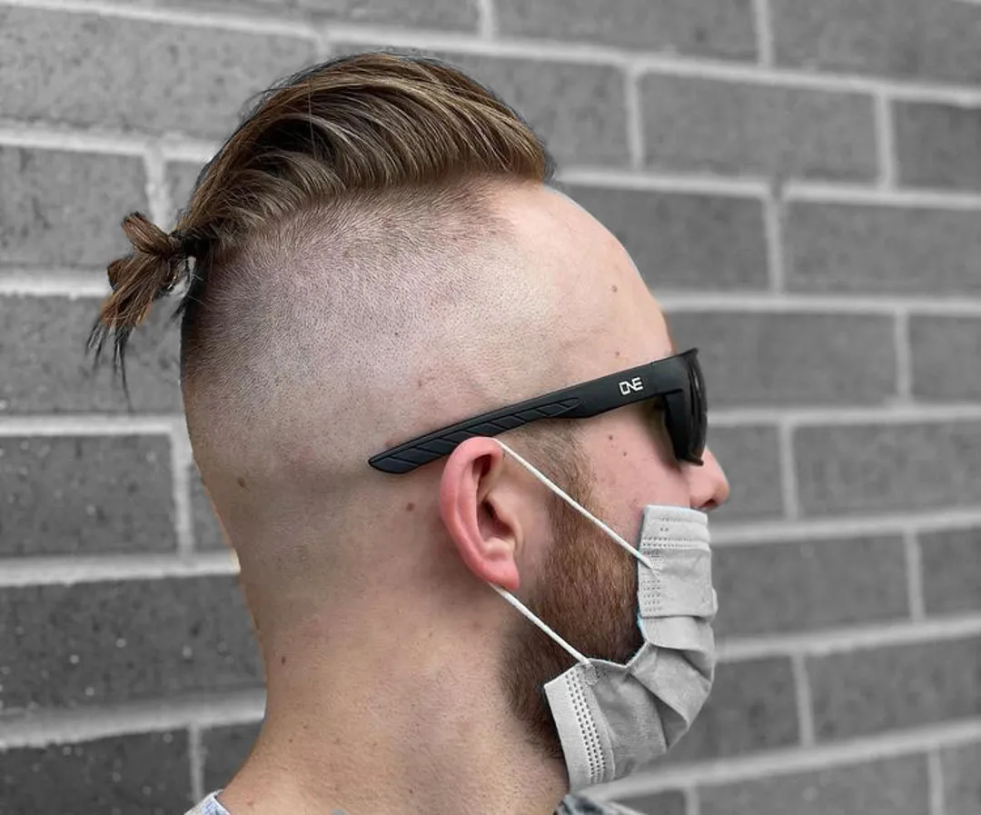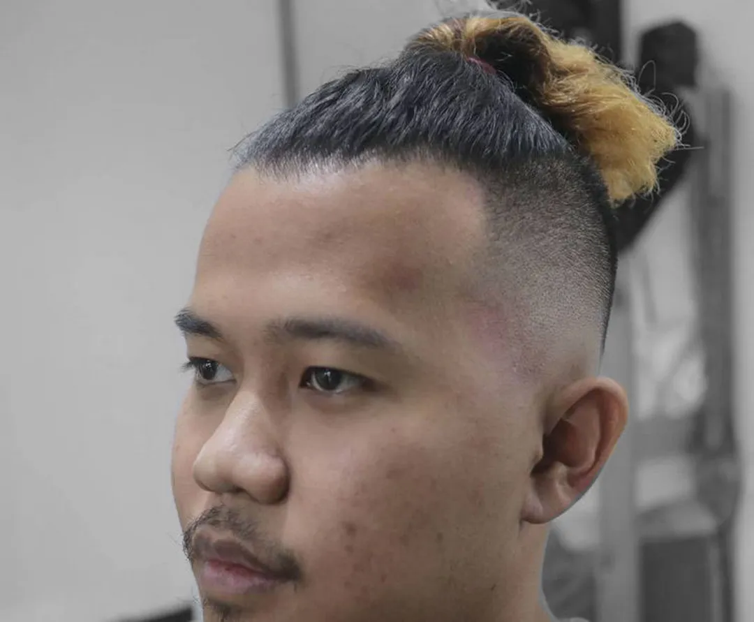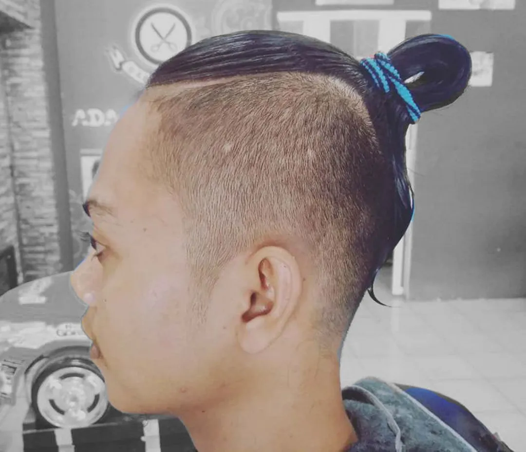 Чтобы сделать эту прическу, сделайте Андеркат и выбрейте линию волос, начиная с середины головы. Таким образом, на макушке остается небольшая часть волос. Расчешите длинные волосы на затылке и завяжите их резинкой.