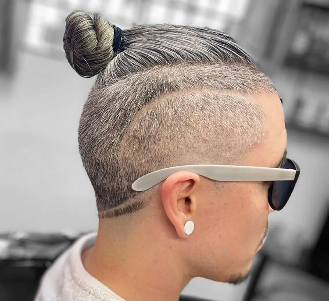 Чтобы добиться этого образа, начните создание прически с зачесывания прядей назад, а затем завяжите волосы в узел. Сначала делается Андеркат, а затем волосы стригутся в технике «фейд» — начиная с теменной области головы длина волос делается все меньше и меньше, самая минимальная длина делается у затылка и вокруг ушей. Это верный способ получить максимум внимания к своему образу!