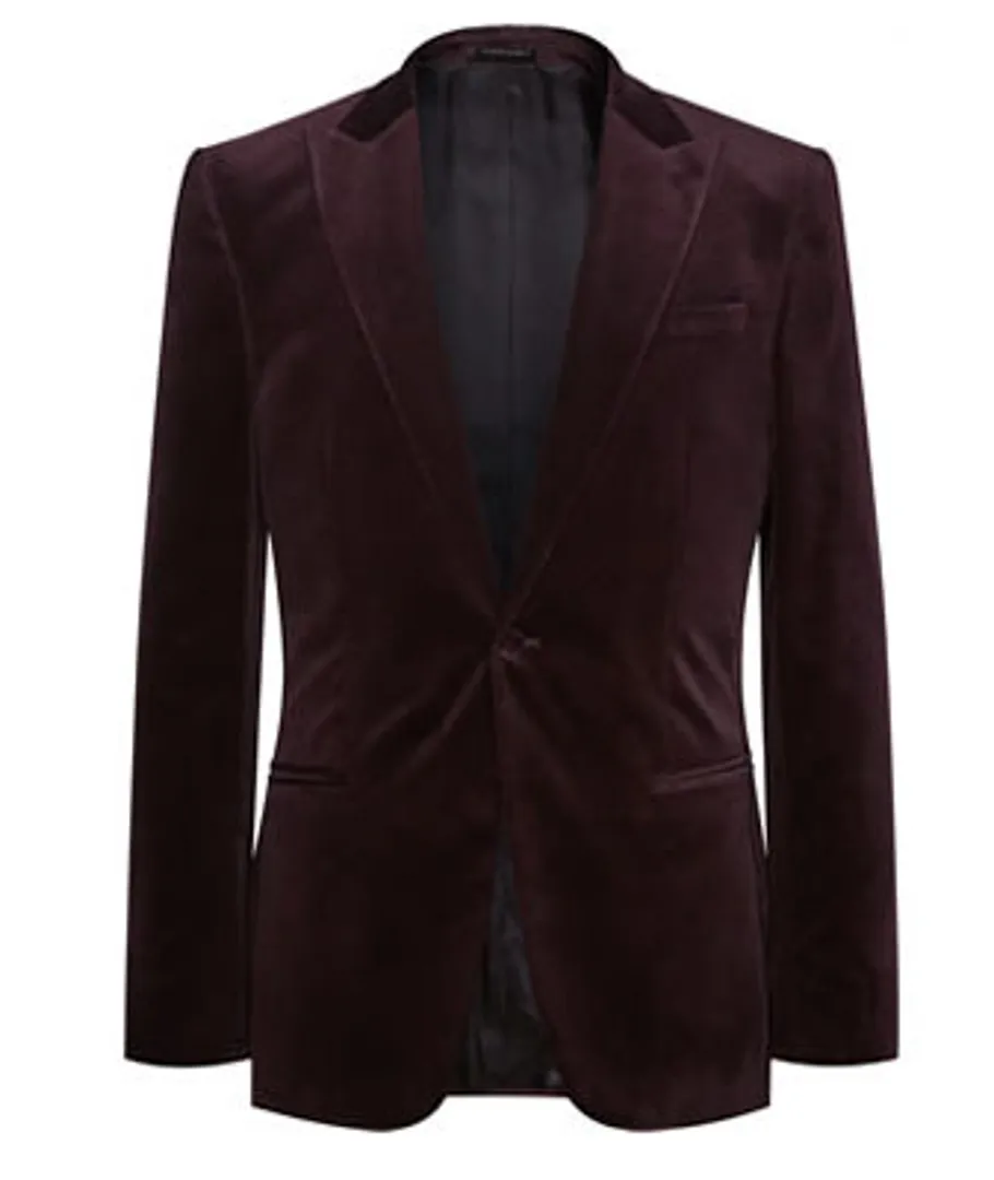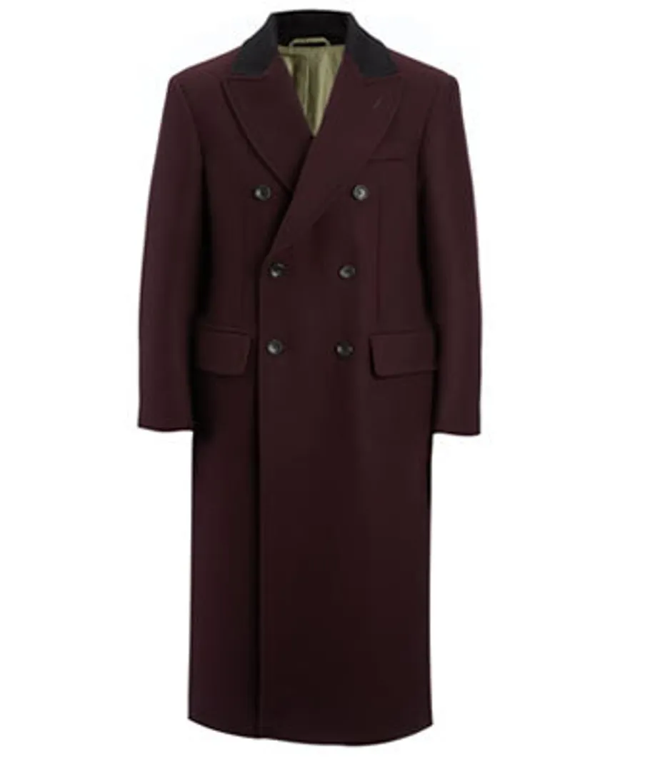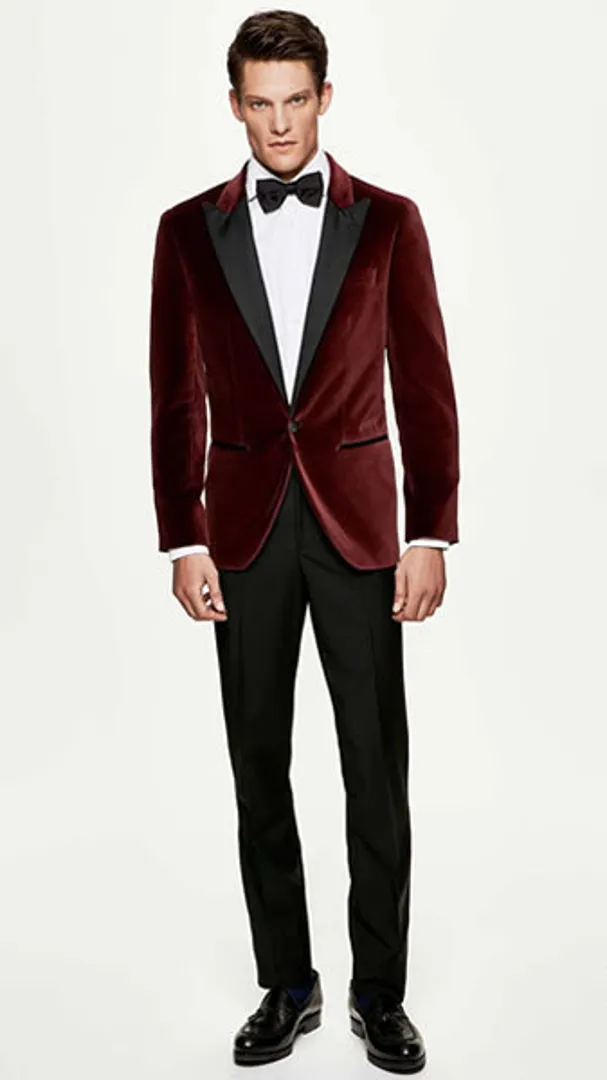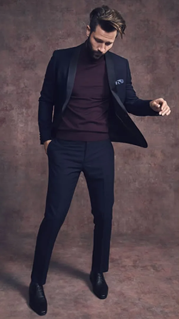 Обратите внимание на черные джинсы и плотный трикотаж с пальто цвета рубинового вина. Или украсьте свой сезонный наряд в стиле черных галстуков бордовым смокингом. Ваше здоровье.