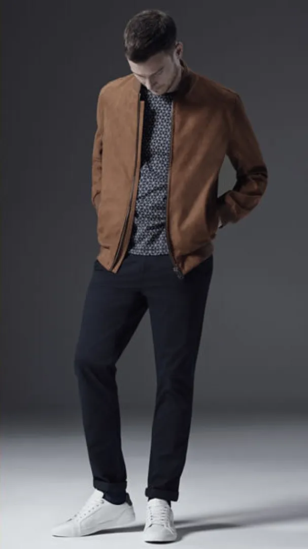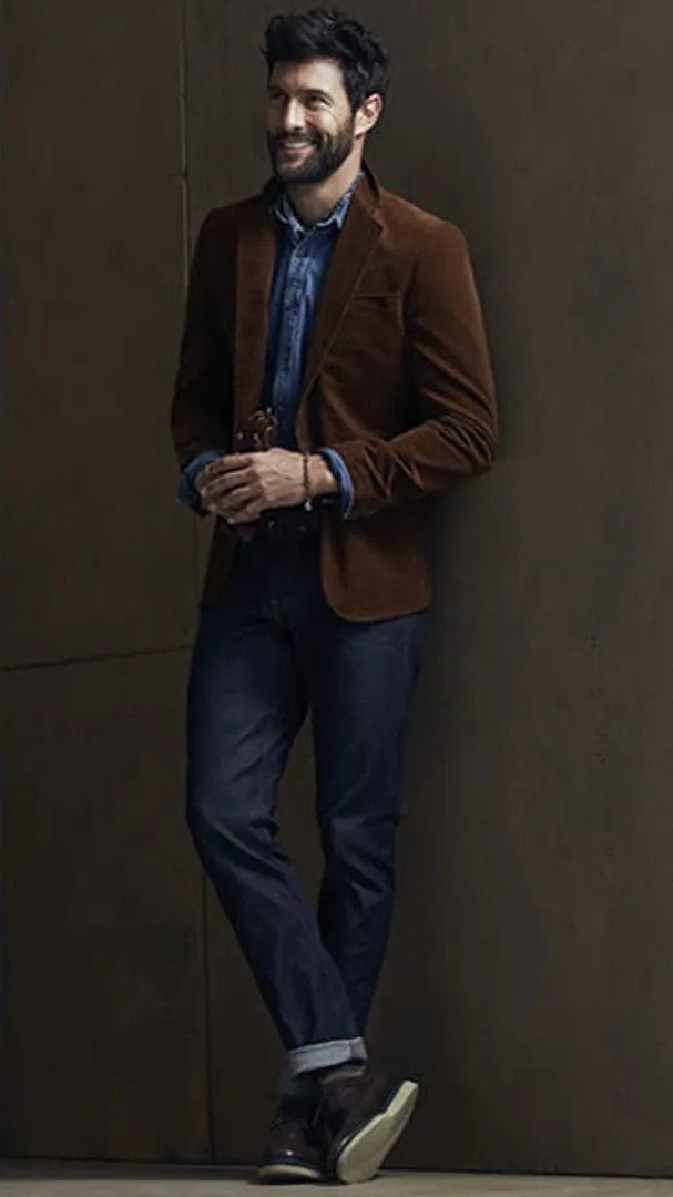 Коричневые и текстурированные ткани — лучшие друзья, будь то толстый трикотаж, шерстяной пиджак, пальто в елочку или замшевый жакет. Объединяйтесь с более простыми узорами в более холодных тонах, такими как темно-синие брюки или белая рубашка.