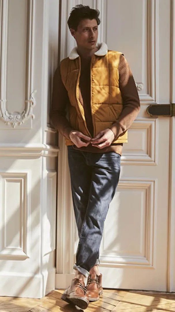 Толстовка или трикотаж — самый простой способ добавить горчицу в свою палитру, но, если вы ищете что-то более традиционное, отправляйтесь на поиски. Оттенок хорошо подойдет для ношения в сочетании с коротким пальто и джинсами — двух основных предметов мужской одежды, которые могут похвастаться морской атмосферой.