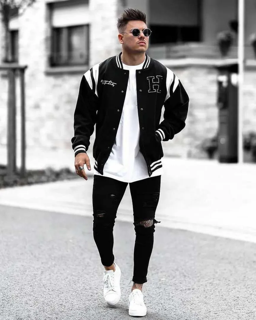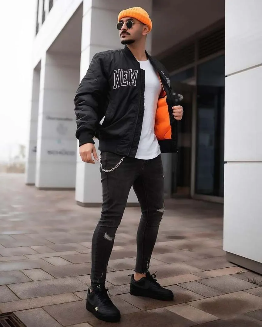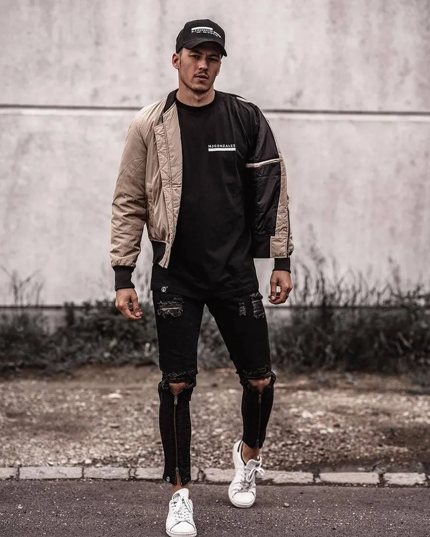 Простой фасон цвета хаки легко сочетать с черными брюками-карго и кроссовками, а также с темными укороченными брюками и рубашкой с рисунком. Покрой должен быть зауженным, поскольку слишком свободный крой бомбера способен мгновенно придать вам объем.