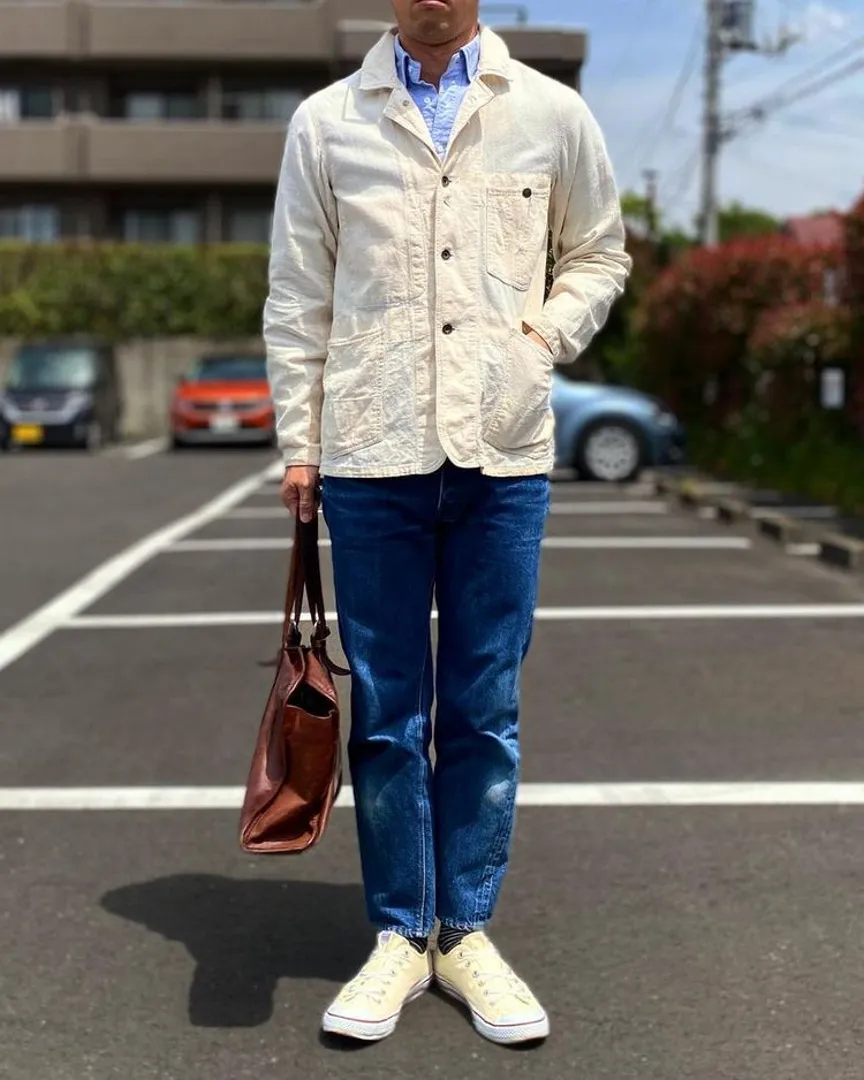 Рабочую куртку можно легко заменить на темный блейзер без подкладки, чтобы придать одежде изюминку рабочего смарт-кэжуал стиля. Наденьте его поверх бретонской футболки или бледно-голубой оксфордской рубашки с темно-синими чиносами и однотонными белыми теннисными кедами.