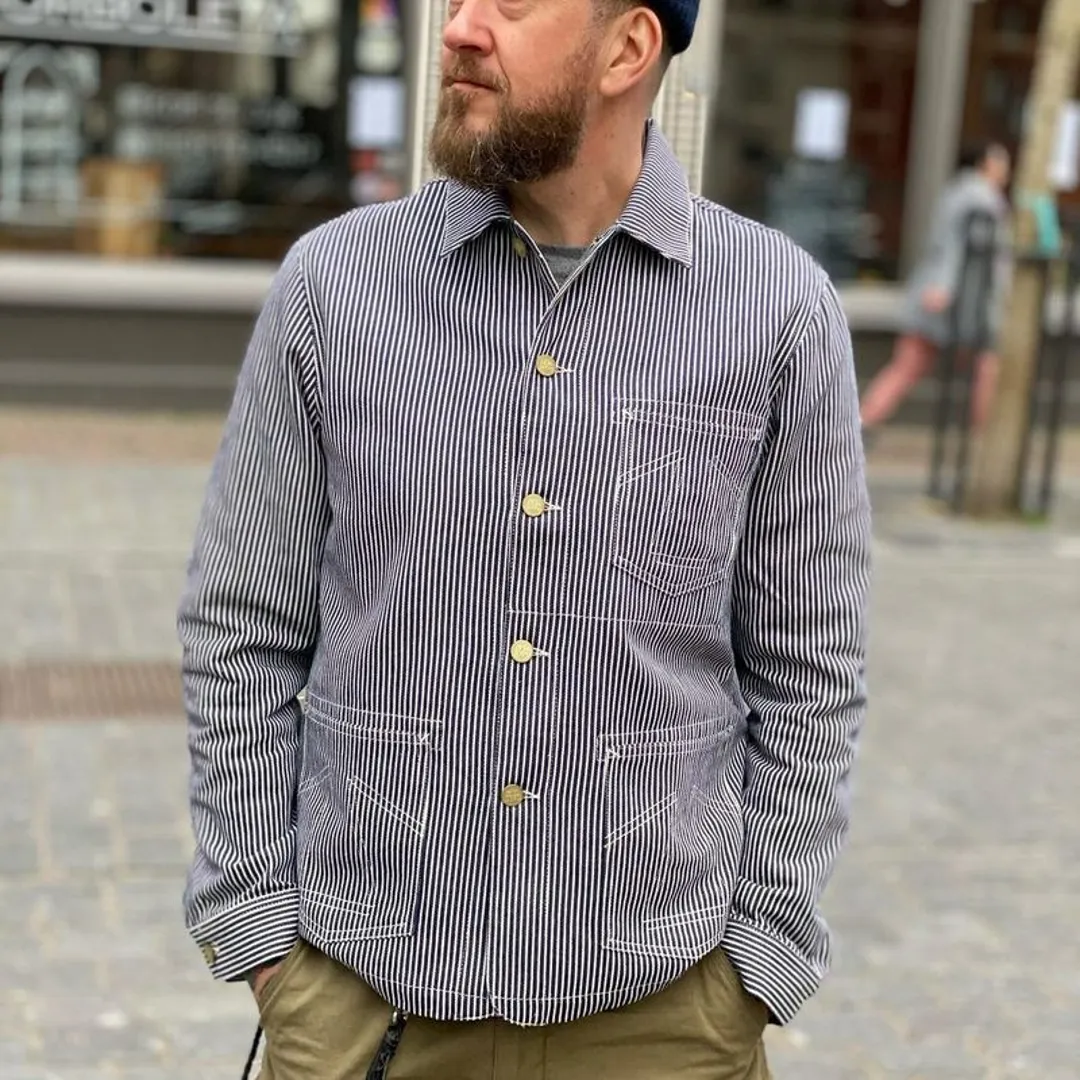 Куртка в полоску Гикори (или «в железнодорожную полоску») прямого кроя, как и ее собратья, с заостренным воротником и четырьмя накладными карманами, была стилизована под рубашку большого размера, на которую она собственно и похожа – рабочие брюки цвета загара и серая футболка или толстовка с капюшоном подойдут как нельзя лучше.
