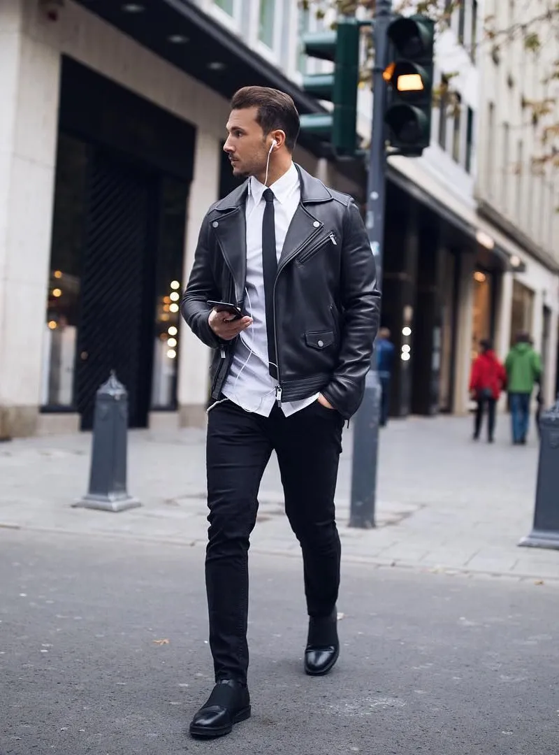 Ношение кожаной байкерской куртки поверх более умной одежды – это стильный ход, взятый прямиком из книги креативного директора Celine (и бывшего маэстро Saint Laurent) Хеди Слимана. Хорошая кожаная куртка, в которой все продумано до мелочей, сидит как вторая кожа, а если сочетать ее с рубашкой и галстуком, то получится просто идеальный образ.