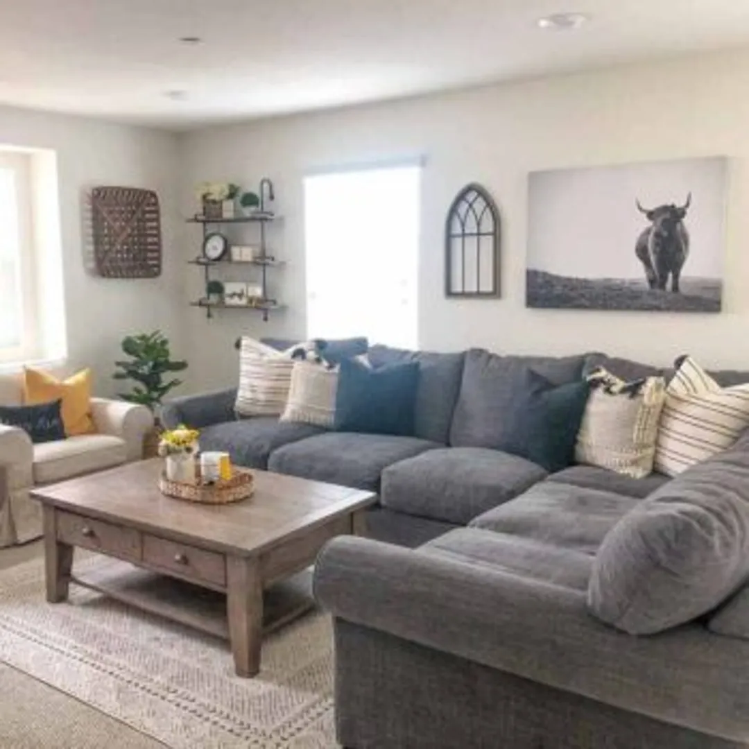 Начните с того, что положите ковер на пол, если у вас есть паркетный пол или плитка. Это позволяет избежать ощущения холода от пола и сделает ходьбу людей мягкой, а также уменьшить шум в комнате. Затем создайте удобные условия для сидения, положив на диван декоративные подушки. Добавьте дополнительные места для сидения по периметру комнаты для многообразия вариантов.