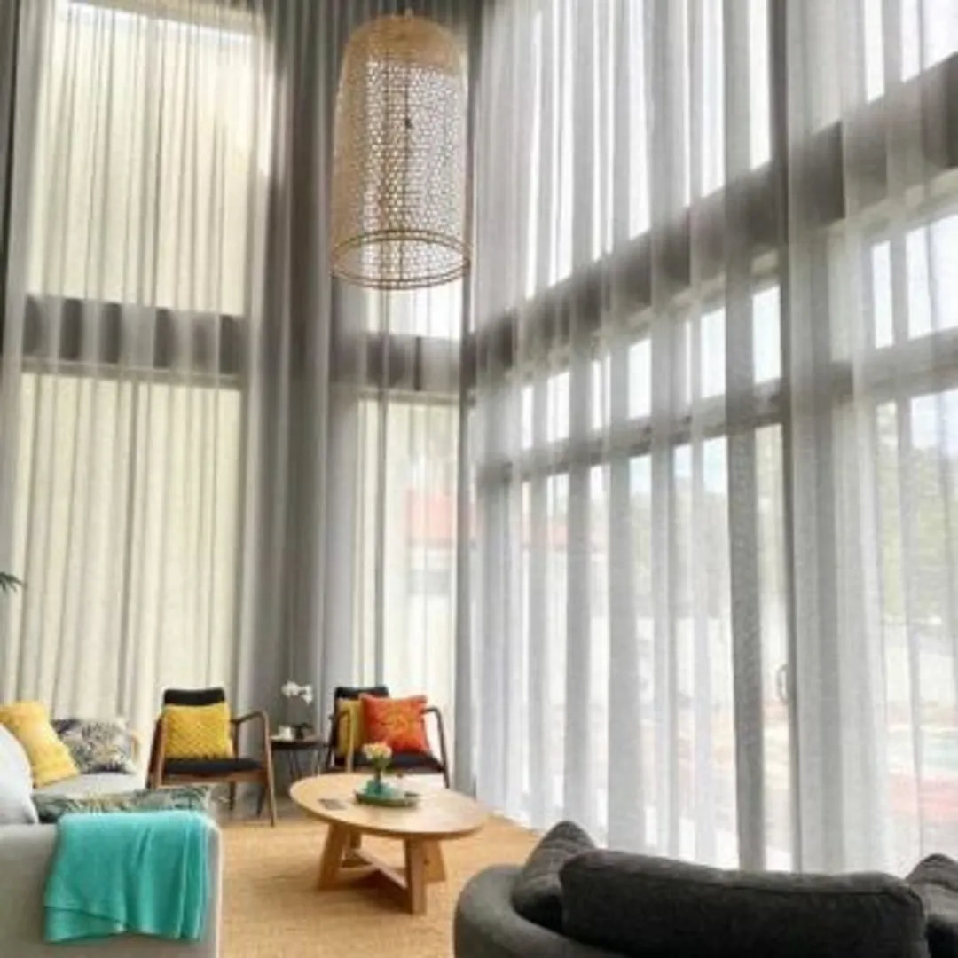 Высокие оконные портьеры идеально подходят для гостиничных высоких потолков. Они необходимы для обеспечения некоторого уровня приватности. Если высота потолка составляет два этажа и более, то, возможно, вы не сможете самостоятельно их установить и поэтому идеальным вариантом станет привлечение профессионального специалиста. Очень важно подстраховаться во время выполнения проекта «Сделай сам».
