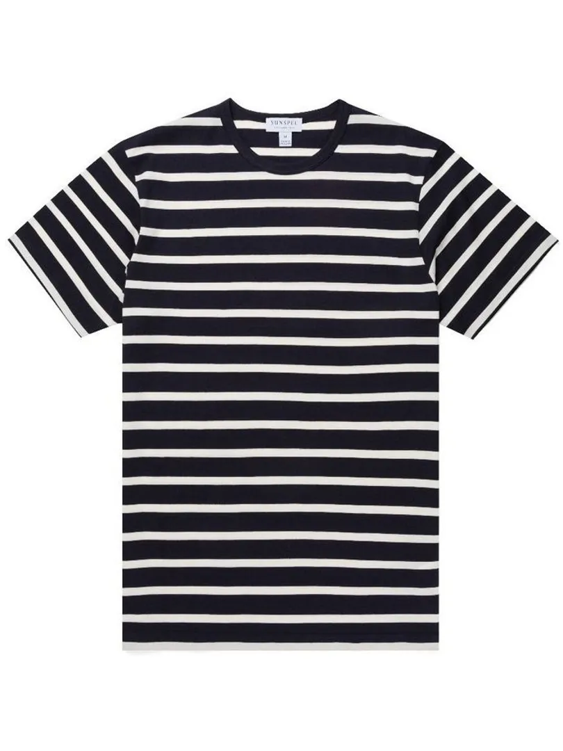 Используйте полосатый вариант в качестве холста, на котором можно нарисовать остальную часть вашего наряда, добавив темные хлопковые брюки с немного укороченными штанинами, дающие лодыжкам немного солнечного света, а также пару кроссовок.