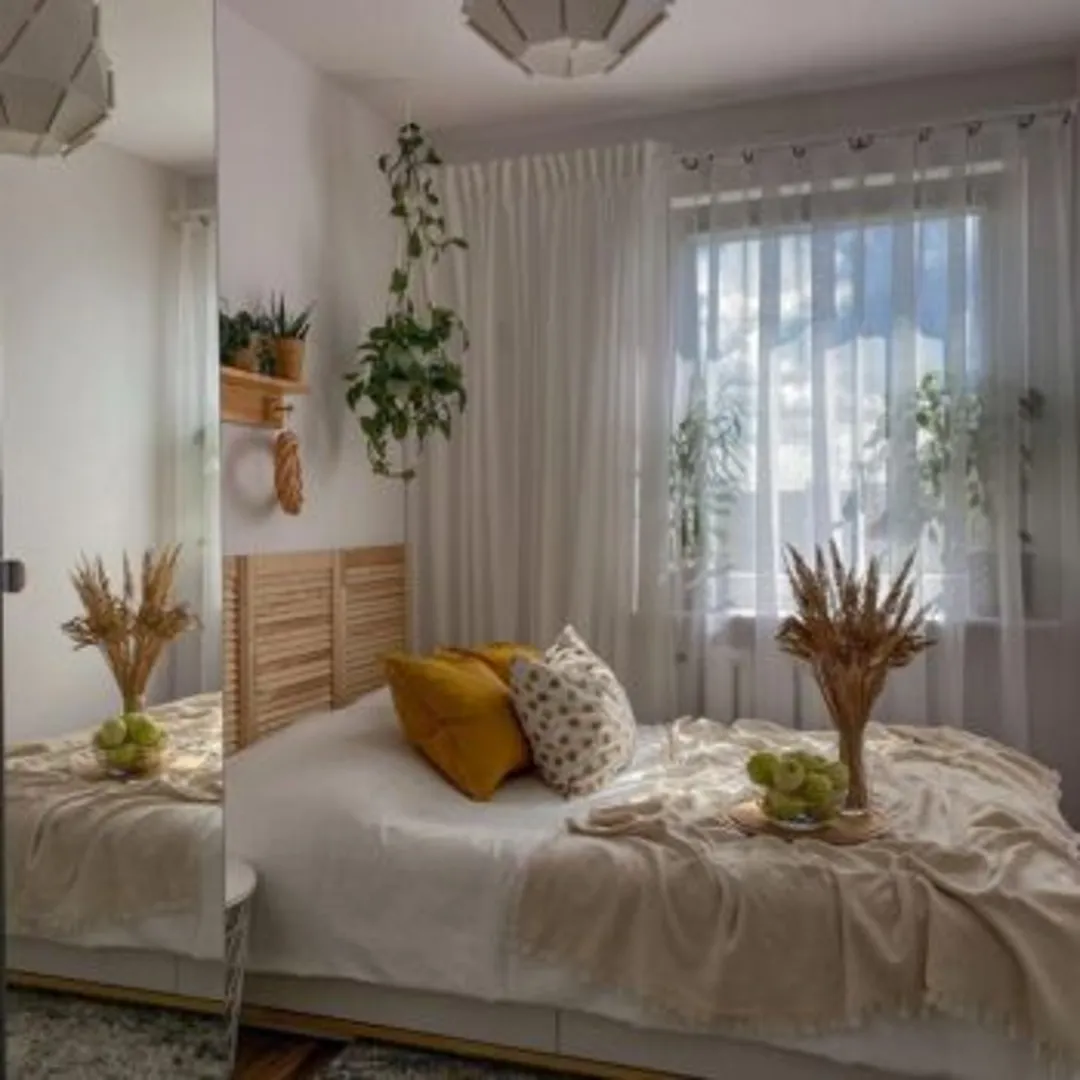 Применение натурального дерева в интерьере маленькой спальни придает помещению воздушность и легкость. Деревянные изделия создают иллюзию большего пространства, а также дают возможность использовать такие вещи, как поддоны, даря им новую жизнь. Добавьте в спальню зелени, чтобы комната ожила.