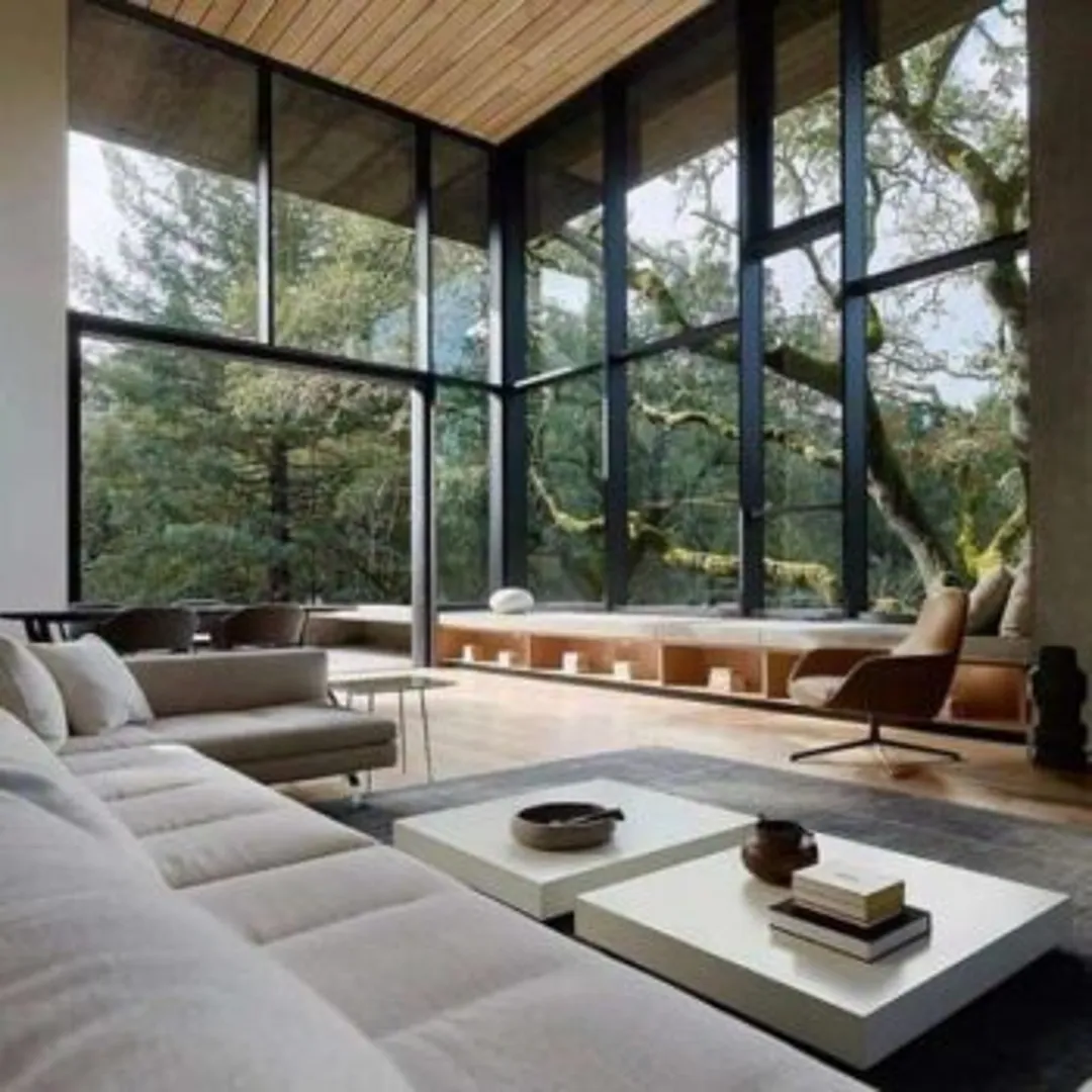 Однако, если из вашей гостиной открывается вид на красивый пейзаж, то лучше подойдет противоположный подход. В одной из стен могут быть устроены большие стеклянные двери или окна. Мебель расположите так, чтобы можно было наслаждаться потрясающим видом, пребывая при этом в комфорте вашей гостиной. Если вы поставите мебель напротив окон, то где бы вы ни сидели, у вас будет хороший обзор.
