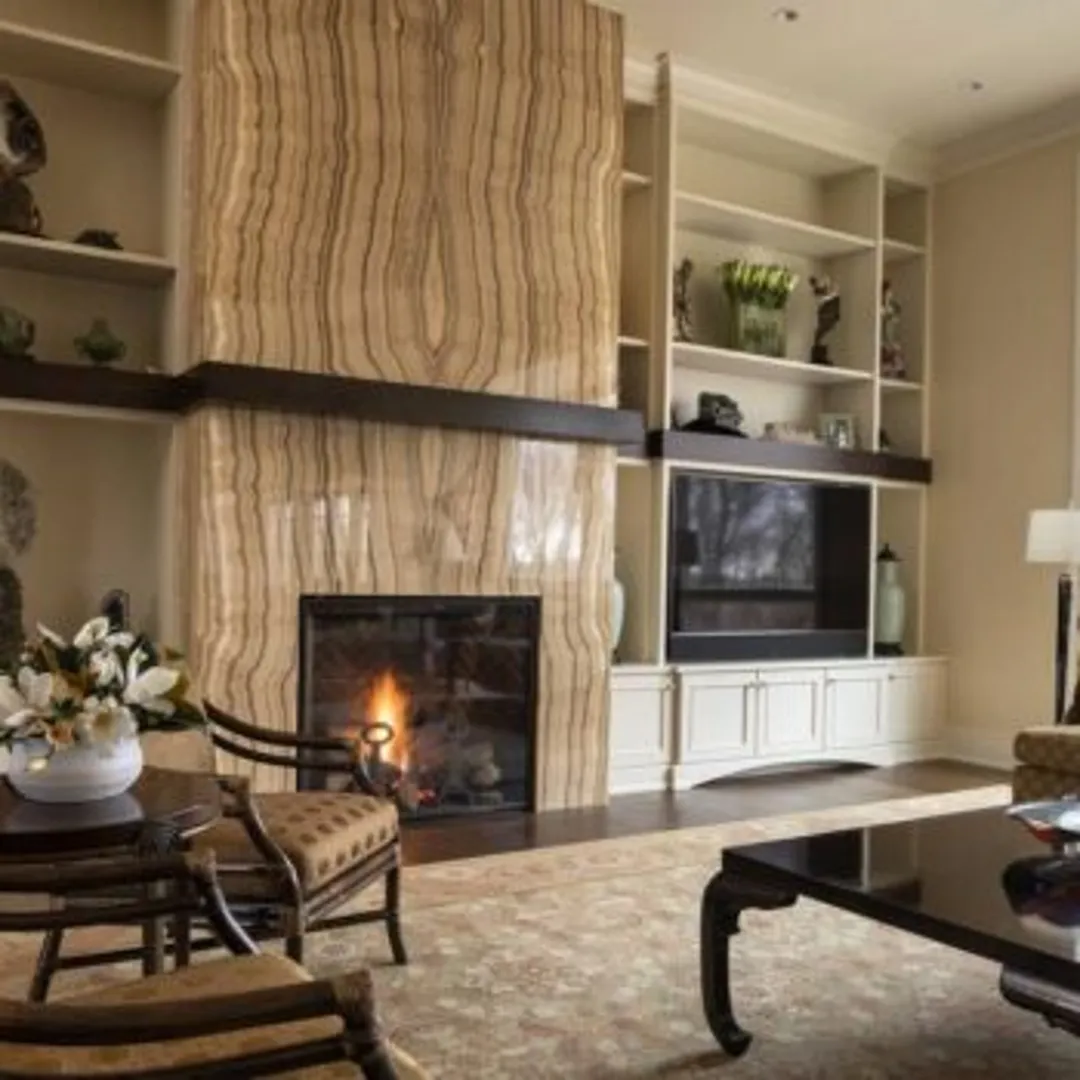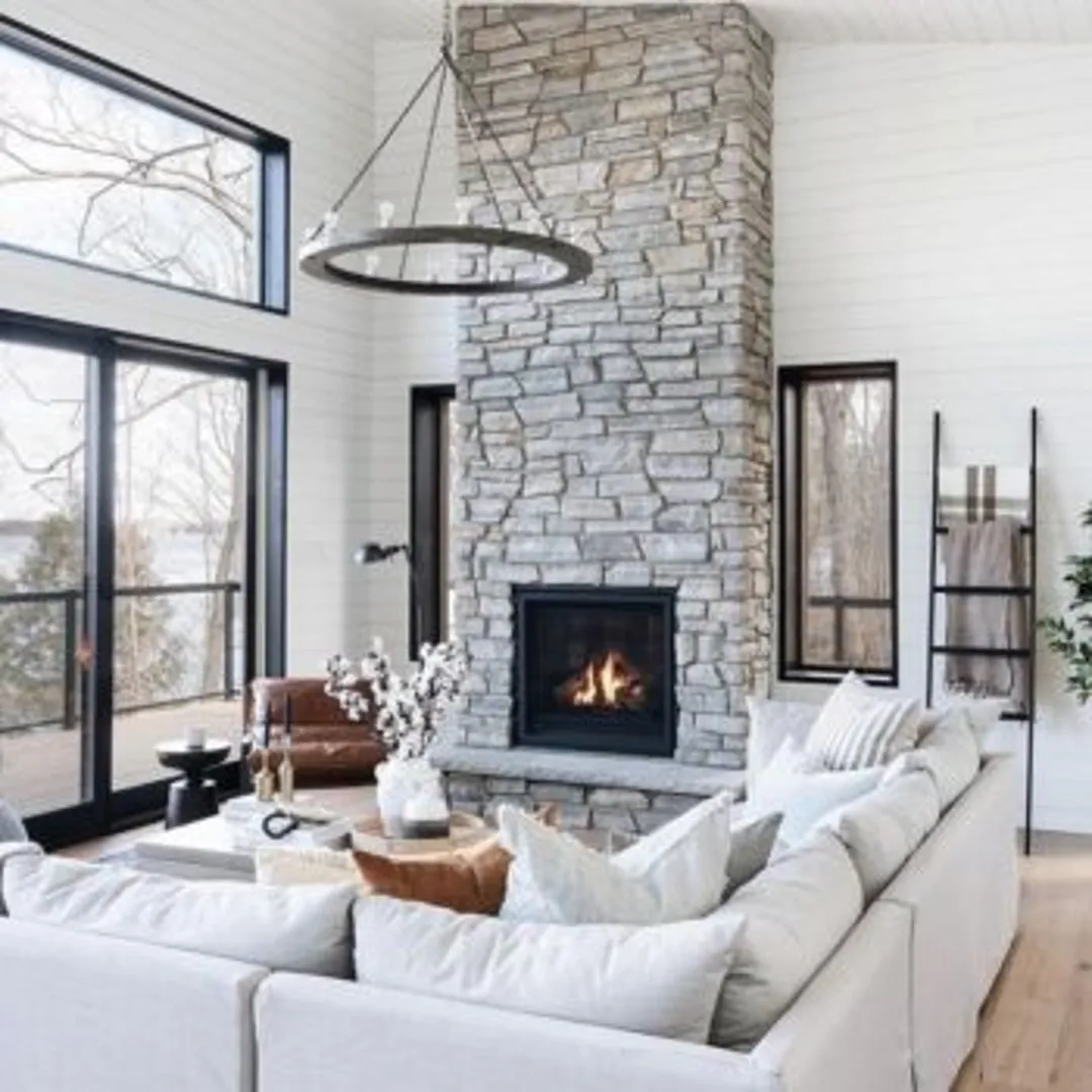 Камин, находящийся на короткой стене, можно обрамить двумя кушетками, параллельными друг другу, перпендикулярными к камину. Это выделит камин и уравновесит пространство. Затем дополните интерьер акцентными стульями напротив камина и журнальным столиком посередине.