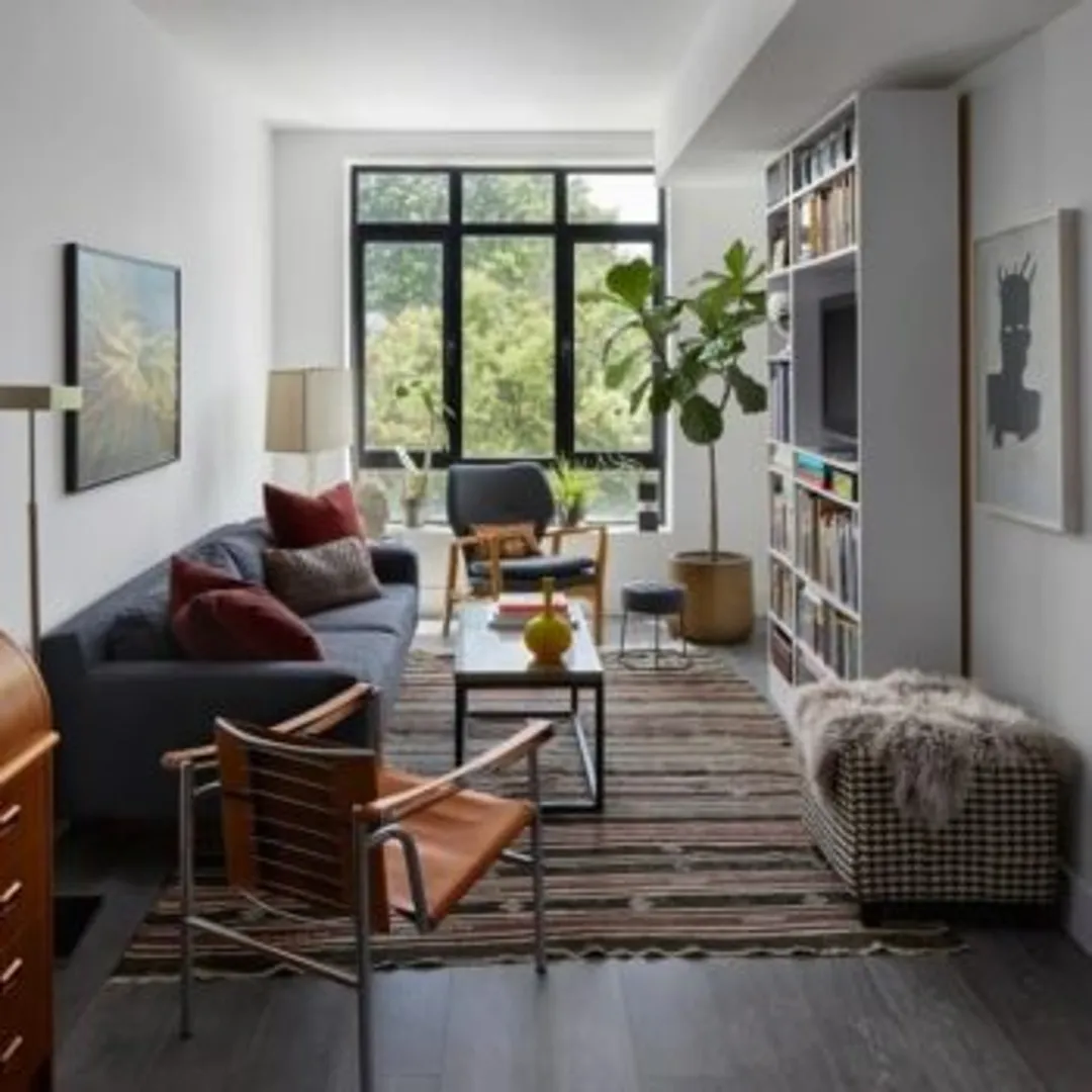 Другой подход к обустройству узкой комнаты состоит в использовании предметов мебели с меньшей площадью основания. Вместо того, чтобы пытаться втиснуть в комнату большой, длинный диван, можно приобрести несколько кресел. Разделение пространства с помощью нескольких предметов мебели скрадывает узость комнаты. Светильники при таком подходе предпочтительнее встроенные, а не подвесные, распределите их по всему потолку.