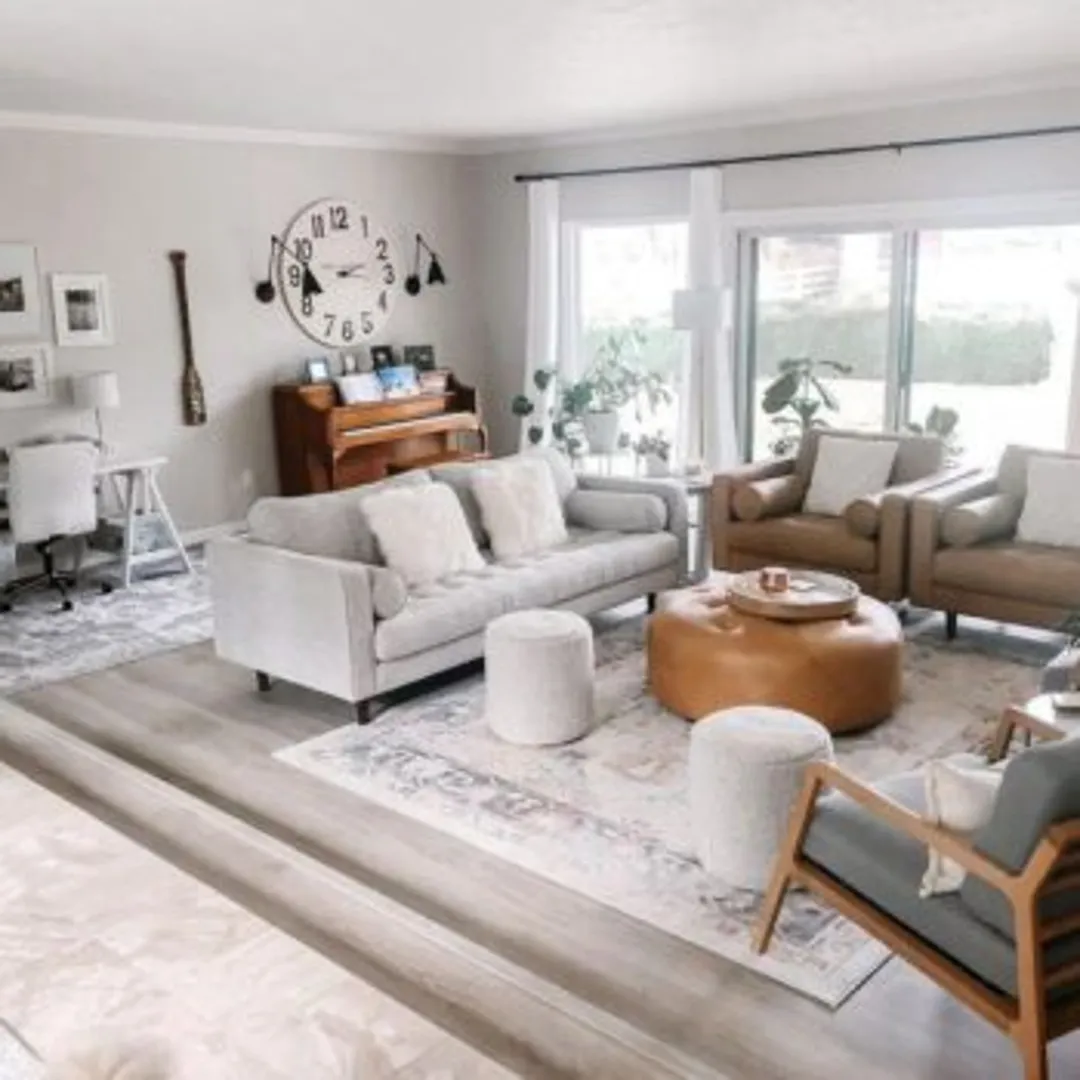 Если у вас большая гостиная, вам нужно заполнить много пространства. Есть опасение, что иначе комната может выглядеть пустой или холодной. Можно использовать мягкие диваны большого размера. Постарайтесь, чтобы масштаб мебели соответствовал помещению. Если вам не доставляет удовольствия минимализм, учтите, что структурированная мебель на ножках придаст пространству ощущение пустоты и будет выглядеть в духе минималистского дизайна.