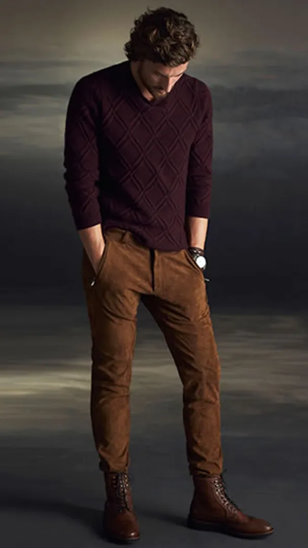 Необходимо подчеркнуть важность использования различных текстур. Даже такая простая вещь, как замшевая обувь, добавленная в эту модную смесь, могут сотворить чудеса. Помимо замши существует еще несколько материалов, которые великолепно выглядят окрашенными в коричневый цвет, такие как кожа и вельвет.