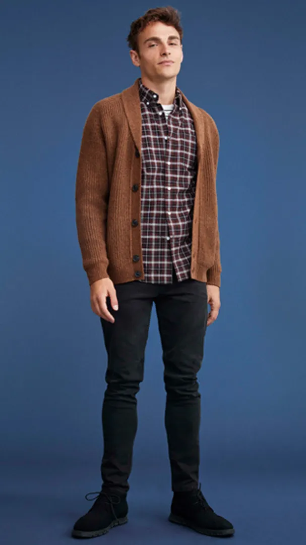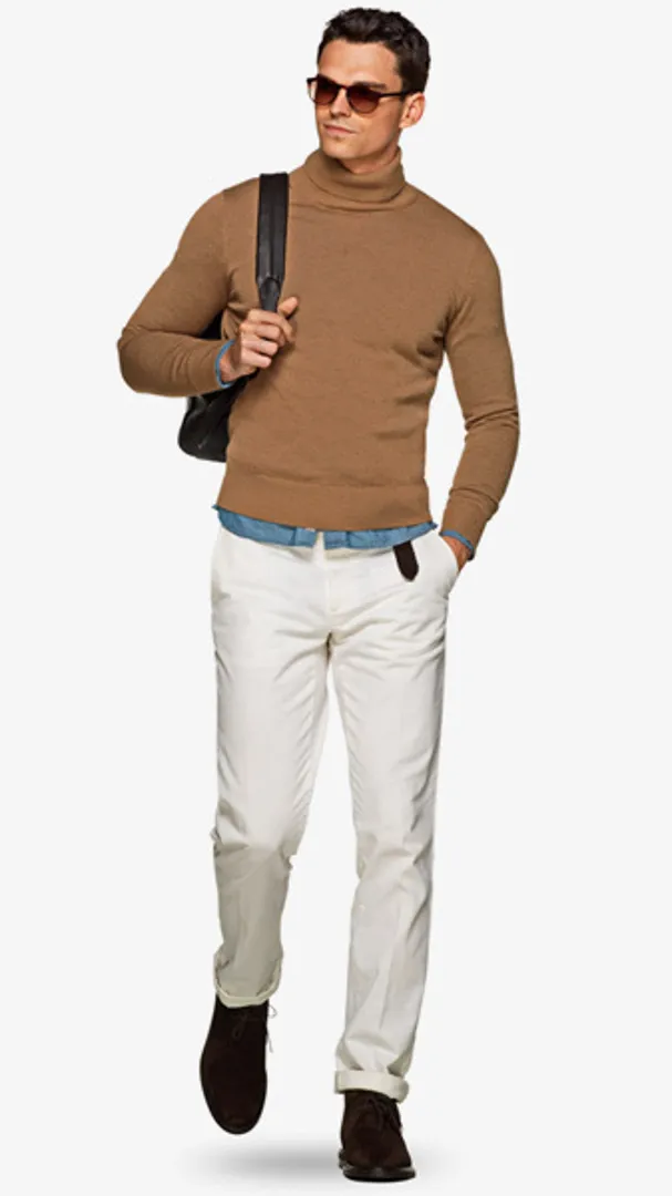 Чтобы получить правильный тональный образ, попробуйте сочетать рубашку шоколадного цвета с верблюжьей рубашкой, вы можете связать все с не совсем белыми брюками и черными ботинками Челси.