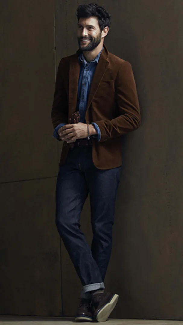 Как мы уже говорили, цвет всегда будет хорошо смотреться как часть тонального наряда. Тем не менее, блейзеры (и пошив в целом) также очень хорошо работают с денимом и шамбре: коричневый блейзер, рубашка из шамбре, темно-синий галстук и темно-синие брюки — отличный выбор.