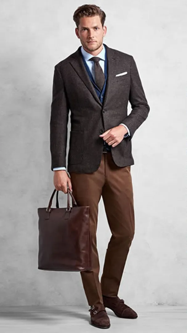 Все эти оттенки, от карамельных до шоколадных означают, что тональные наряды хорошо работают. Тональные наряды — отличный способ выглядеть модно без особых усилий. Попробуйте сочетать темный костюм шоколадного цвета с более светлой рубашкой и туфлями под цвет костюму. Или, если вам не нравятся костюмы, попробуйте облегающие брюки чинос темно-коричневого оттенка с верблюжьим пальто и более светлым трикотажем.