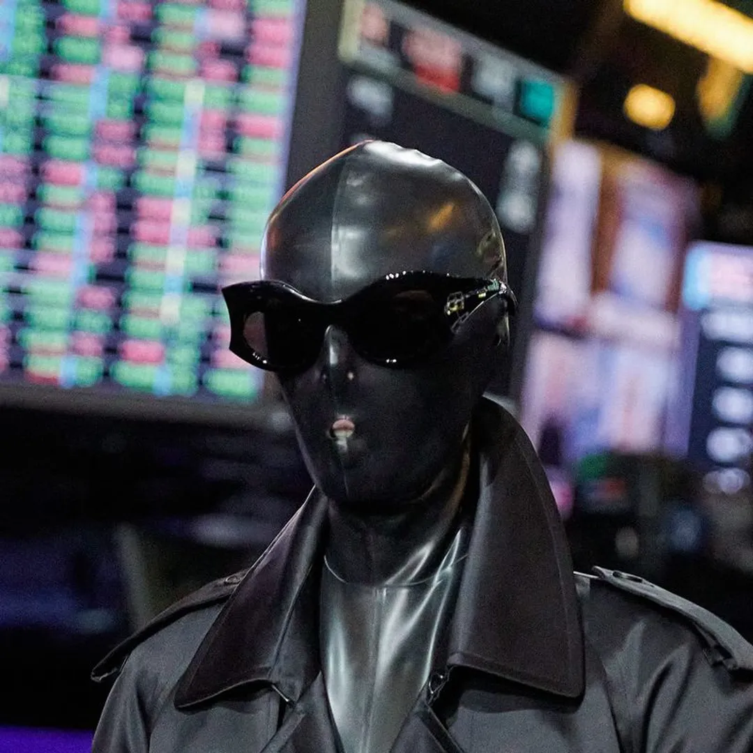 Показ стартовал, конечно же, под звук гонга, сигнализировавшего начало открытия Нью-Йоркской фондовой биржи. В то время как томная техно-музыка разносилась по помещению, а котировки акций на мониторах JP Morgan по всему залу начали прыгать, в проходах появились модели в латексных масках извращенцев.