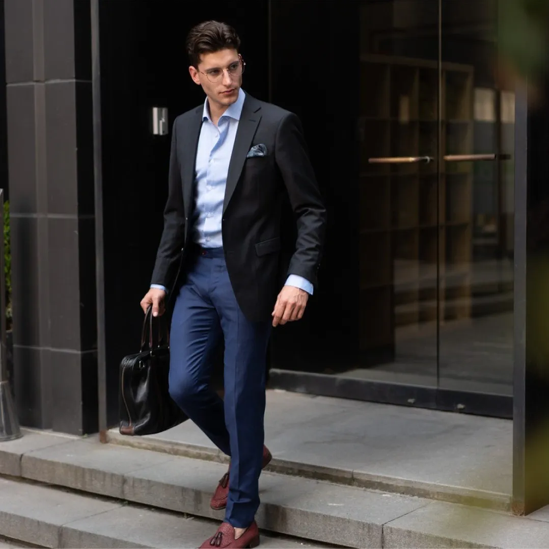 - Ключ: Пиджак и брюки из разных тканей, но близких тонов и формального характера.