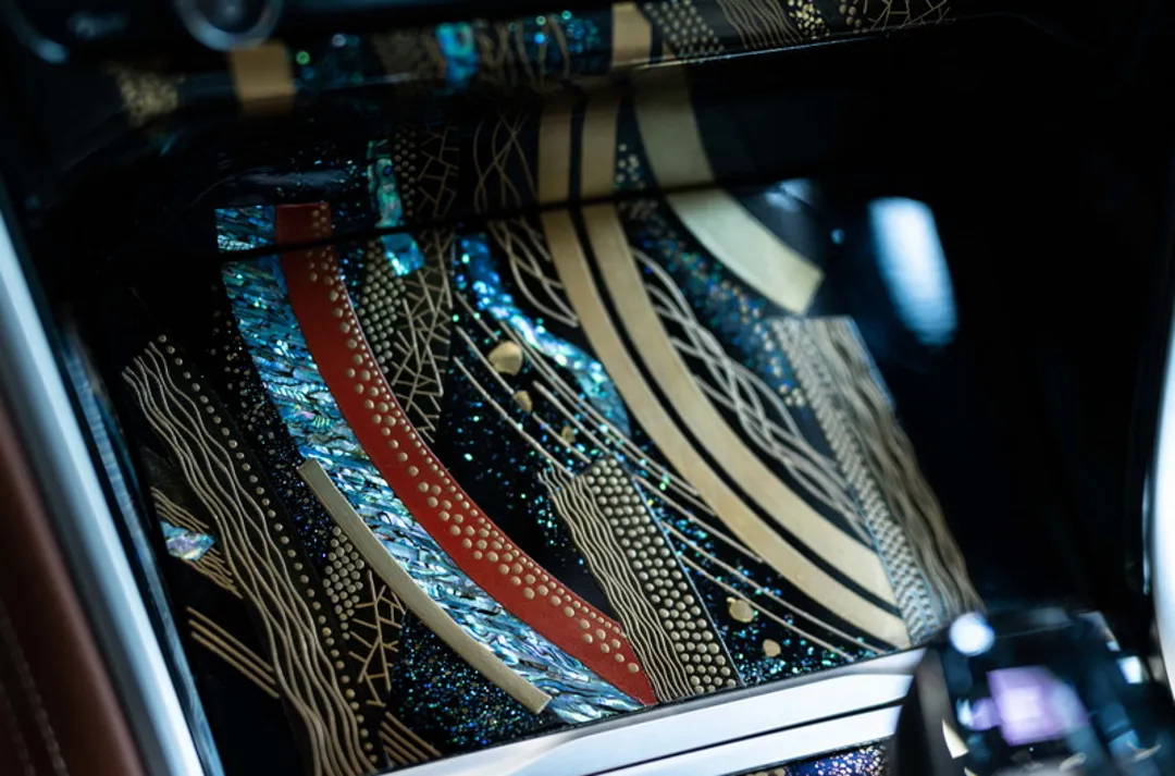 Описать простым языком это невероятное произведение автомобильного искусства – все равно, что получить урок японской культуры и истории. Дизайн центральной консоли BMW 8 серии Kyoto Edition выполнен с использованием маки-е (японский лак, посыпанный золотой или серебряной пудрой в качестве декоративного элемента с помощью макизутсу или кебо-кисти) и оттенков золота.
