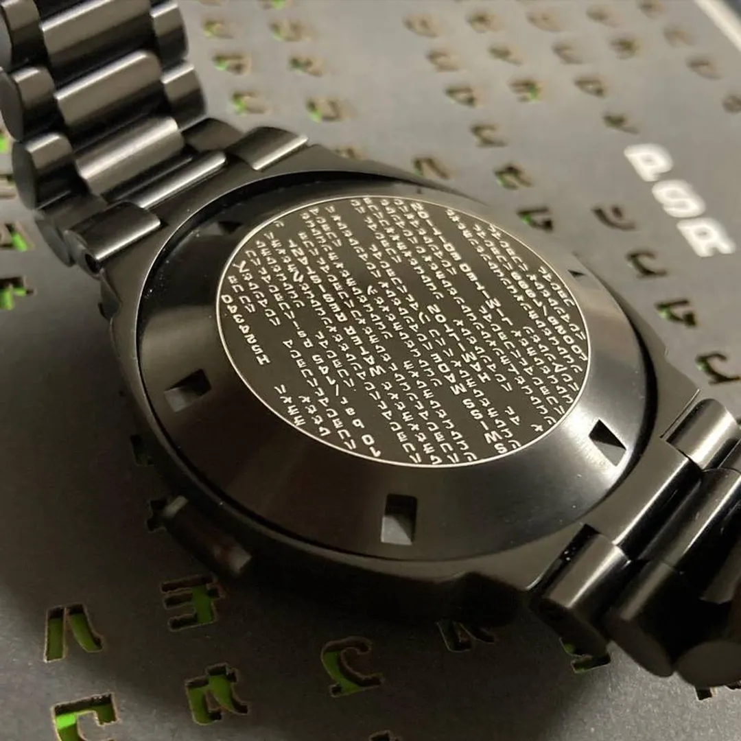 Часы Hamilton PSR MTX возвращают нам те теплые чувства, которые мы когда-то испытывали к Морфеусу, Тринити и Нео. Они полностью черные, за исключением ЖК-цифр зеленого цвета, напоминающих символы матрицы. Цифровой рисунок дождя на обратной стороне часов сразу привлекает внимание любого, кто если не видел весь фильм, то хотя бы трейлер к нему. Дождь из символов также находится на специальной упаковке часов.