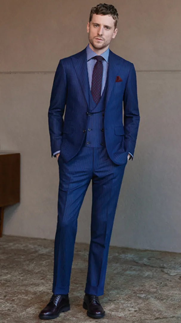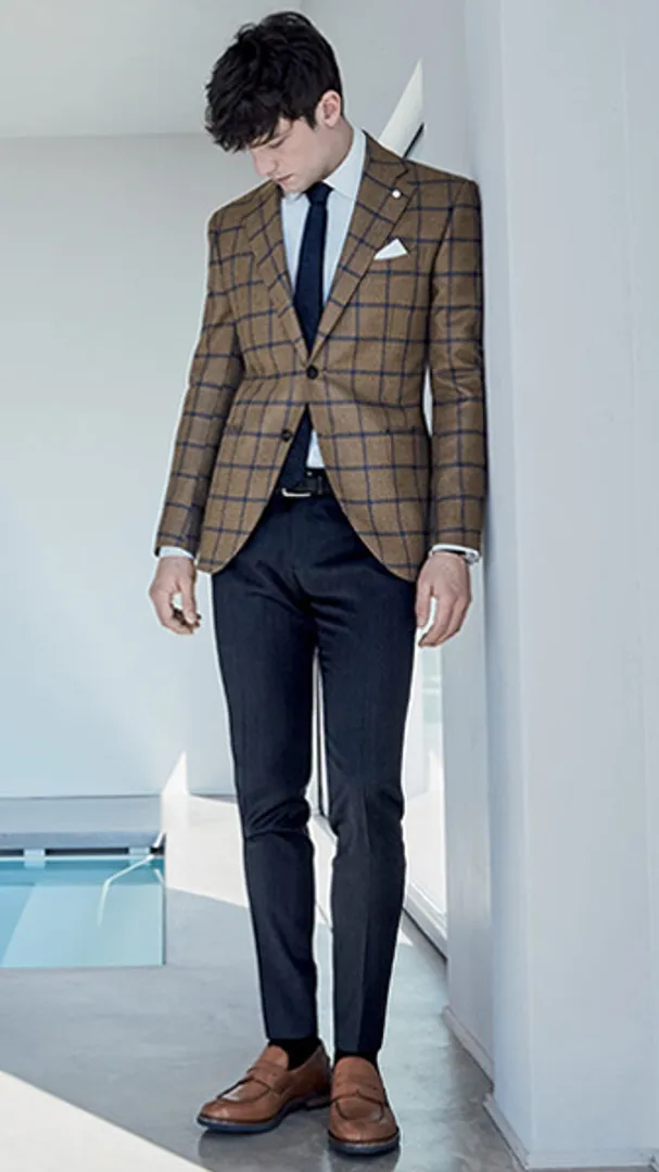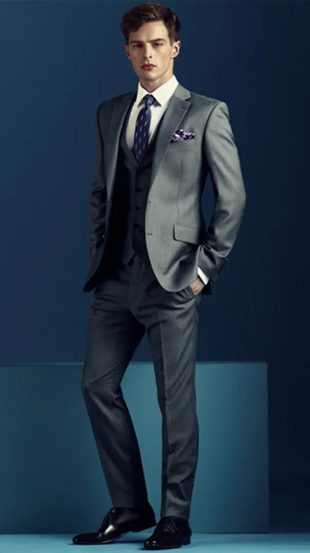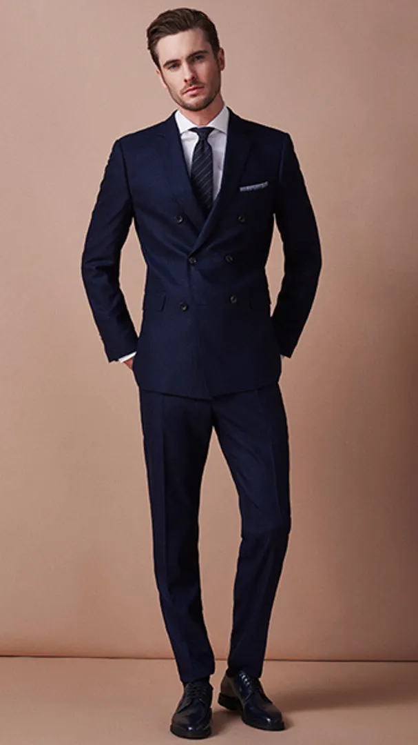 Идеально подходит для худощавых парней: направленные в верх лацканы пиджака делают грудь шире, а защипы на талии создают лестную форму песочных часов. Если у вас невысокий рост, выбирайте пиджак на четырех пуговицах вместо традиционных шести или восьми, чтобы визуально вытянуть силуэт.