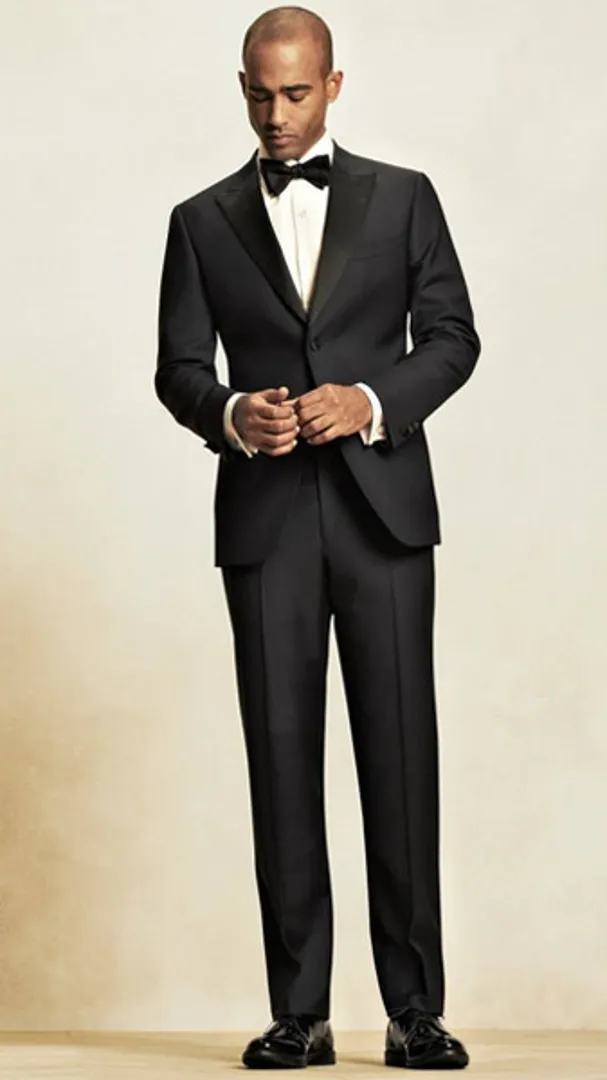 Ваш обязательный список: классический костюм с контрастными лацканами из ткани (например, шелк); брюки с аккуратно подшитыми краями и тесьмой; белая рубашка с отложным воротником; двойные манжеты; запонки, а также какая-нибудь интересная брошь или скрытая пуговица; черные туфли (оксфорды или другие ботинки на шнурках); и настоящий, хорошо завязанный галстук-бабочка (не обманка на резинке).