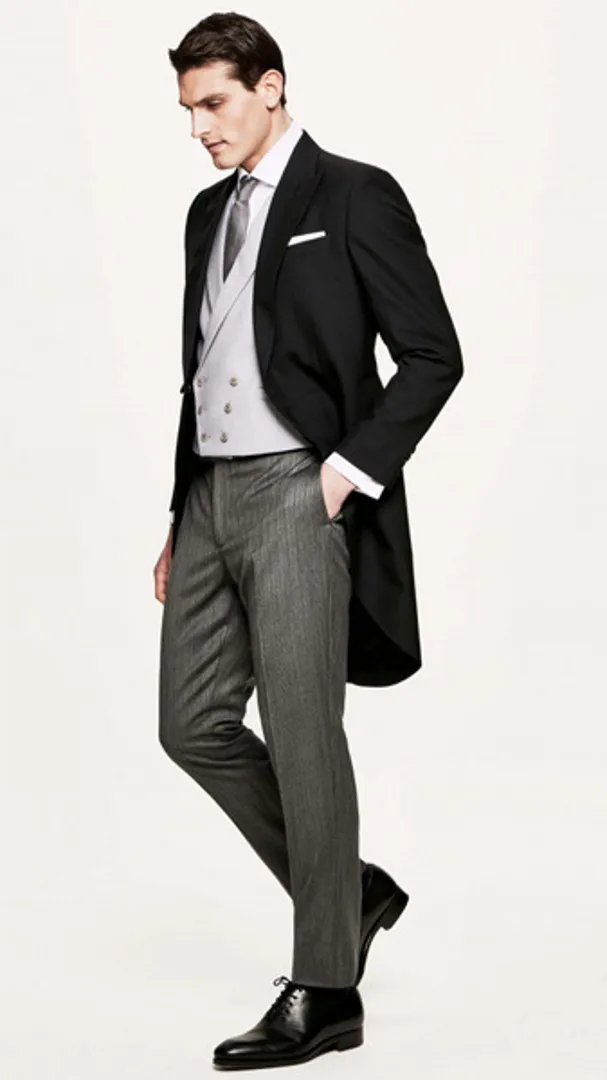 Белый галстук является эквивалентом утреннего женского платья или официального дневного, поэтому не стоит его надевать после 18 часов вечера. Для посещения традиционной свадьбы подойдут следующие элементы гардероба: черное или серое пальто с хвостами, серый жилет, белая или светлая рубашка с отложным воротником, двойные манжеты с запонками, полностью серые или серые брюки в черную полоску и черные туфли.