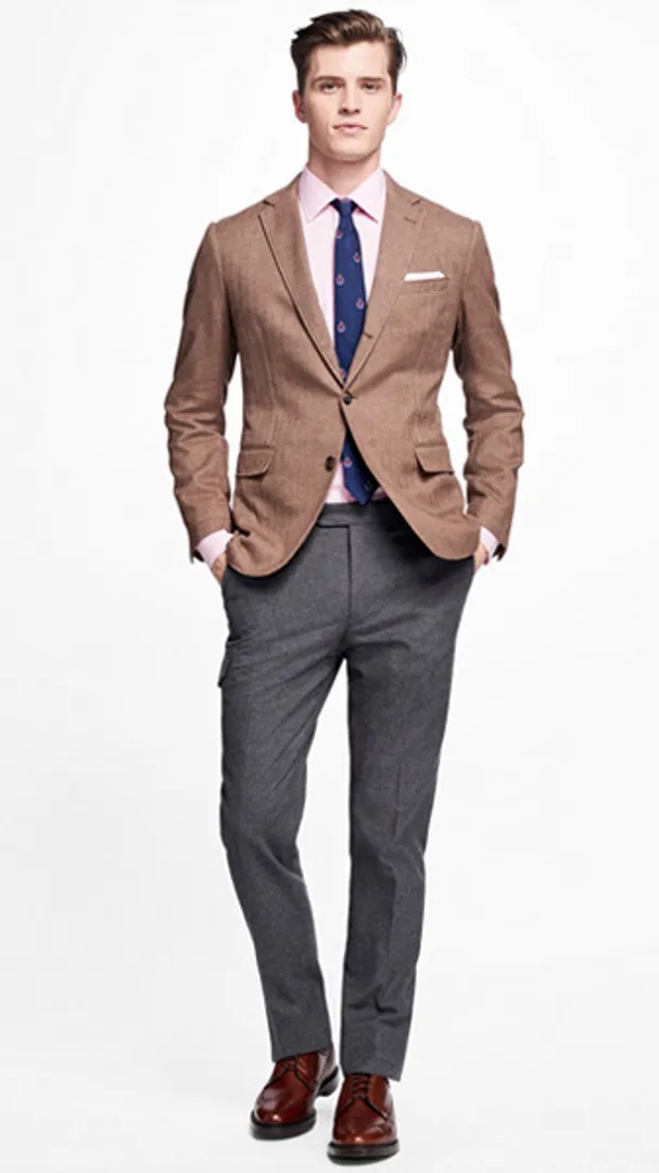 У вас есть возможность расширить цветовую палитру и выйти за пределы консервативных столичных стандартов темно-синего и серого. Что касается цветов, выбирайте более теплые, более нейтральные текстурные тона. Хоть матовые ткани больше похоже на повседневные, они отлично подойдут для загородного мероприятия (также к ним проще подобрать обувь), выгодно будут смотреться различные узоры, клетка и конечно же цветочный принт.