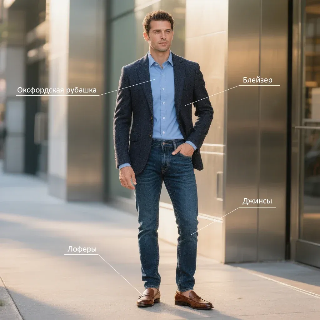 Главный принцип: Контраст формальности между элементами одежды. Джинсы «снижают» пиджак, а пиджак «поднимает» джинсы.
