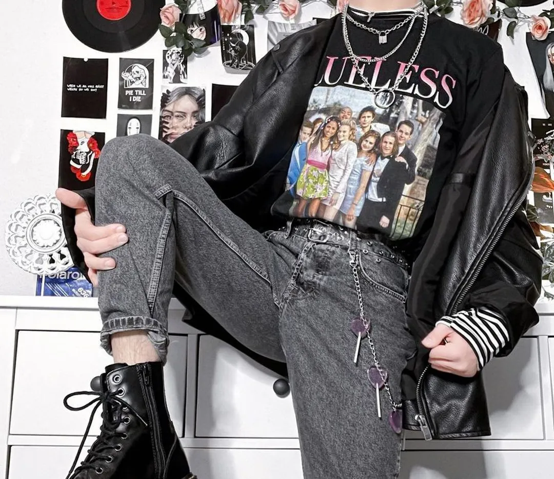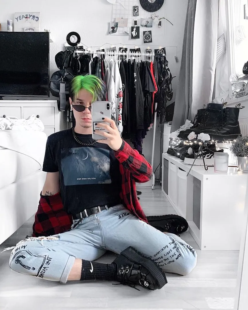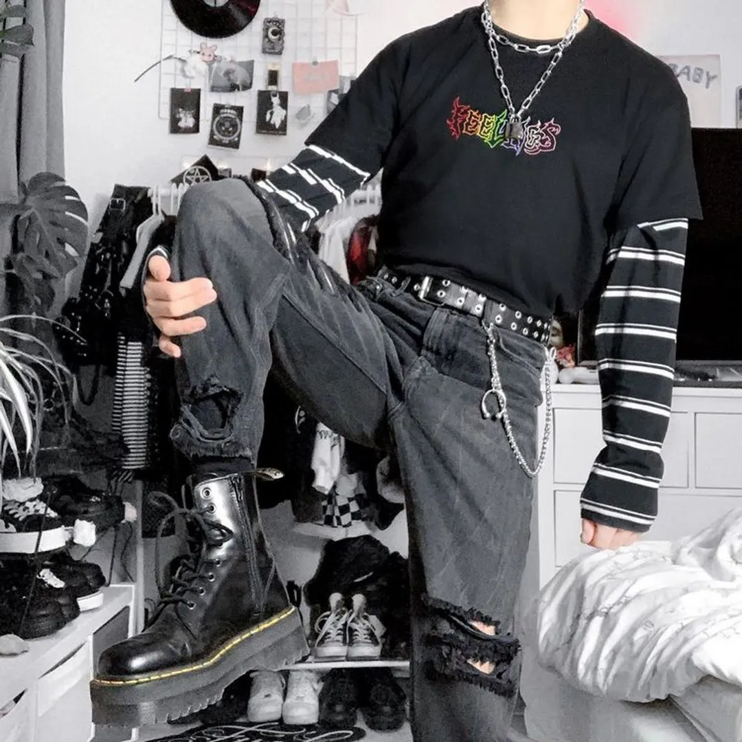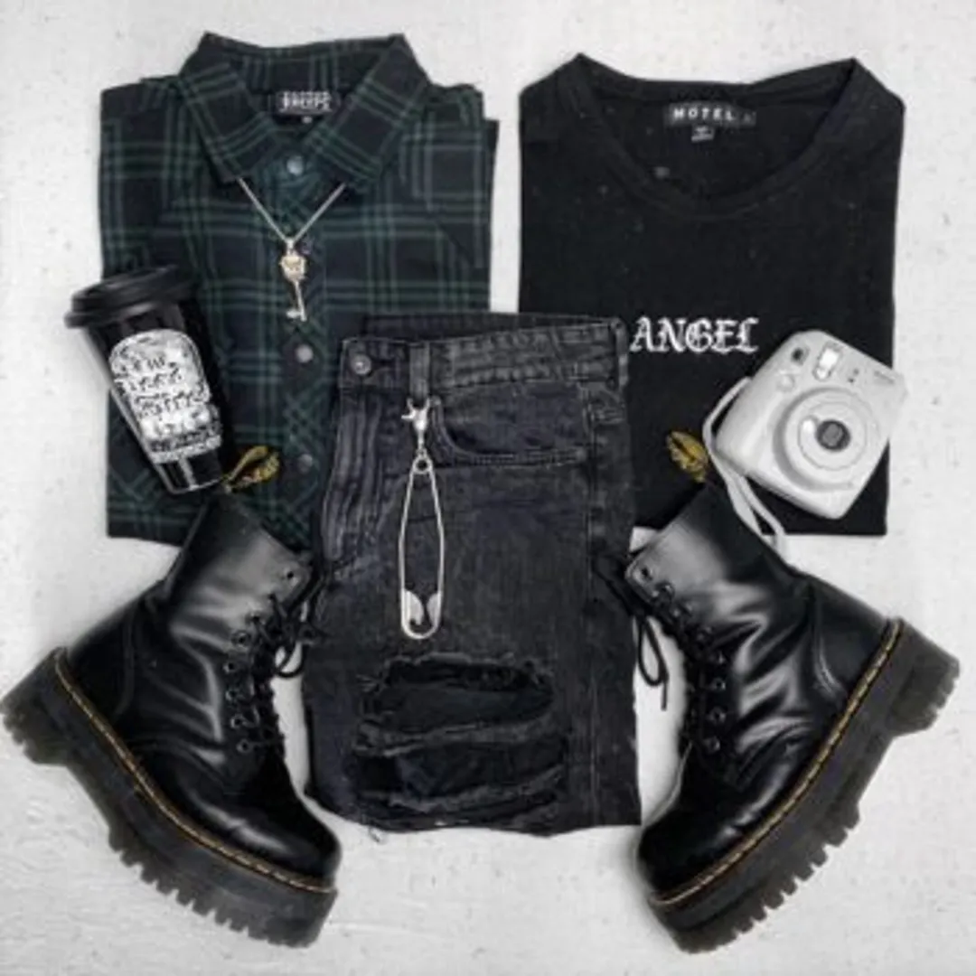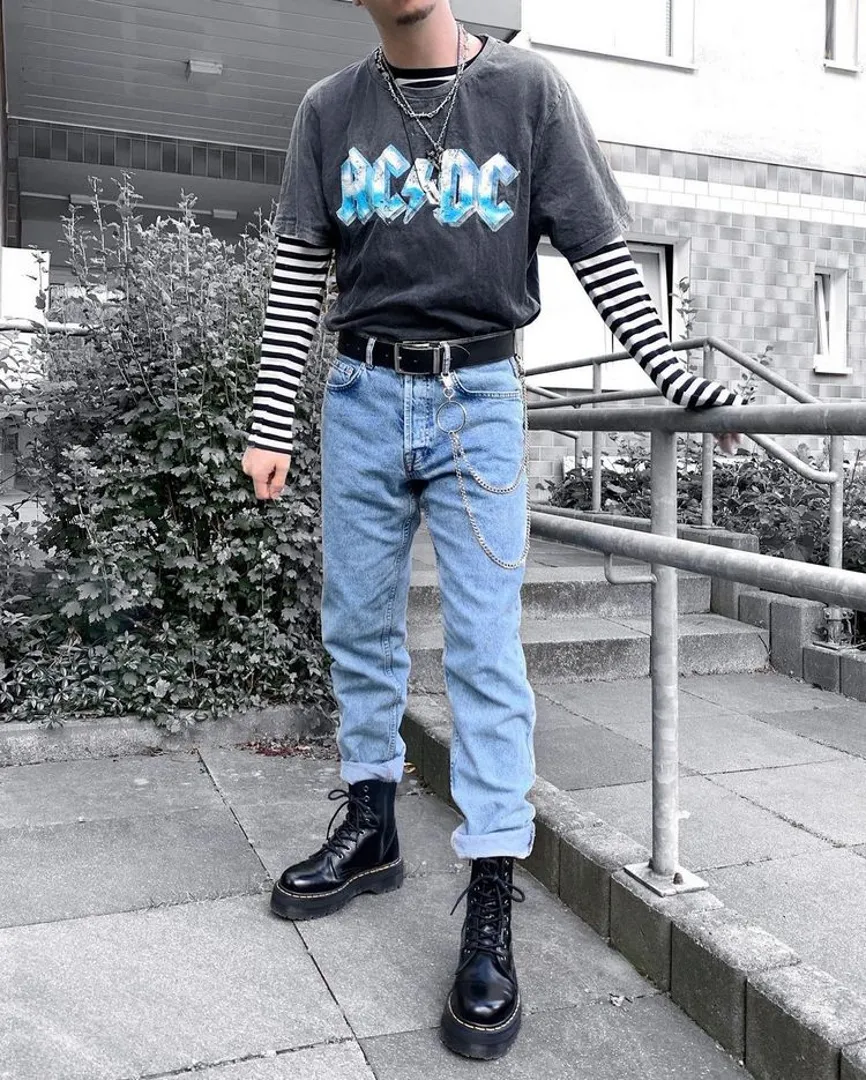 Многие элементы панк-моды кажутся очень театральными и преувеличенными, но стиль также может быть настолько простым и менее шокирующим, насколько вы захотите. Подтверждением слов будет простая пара рваных джинсов, черные армейские ботинки «берцы» и винтажная футболка с принтом музыкальной группы.