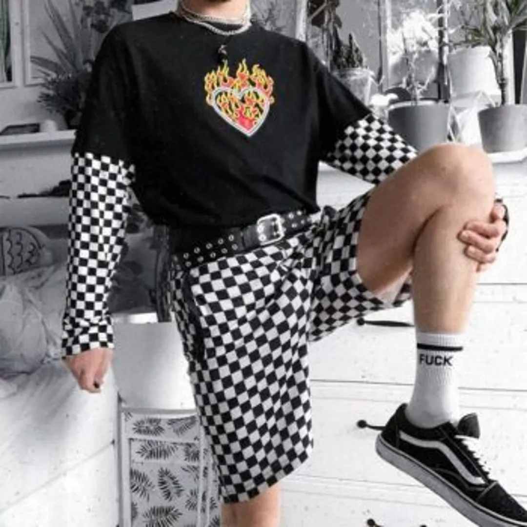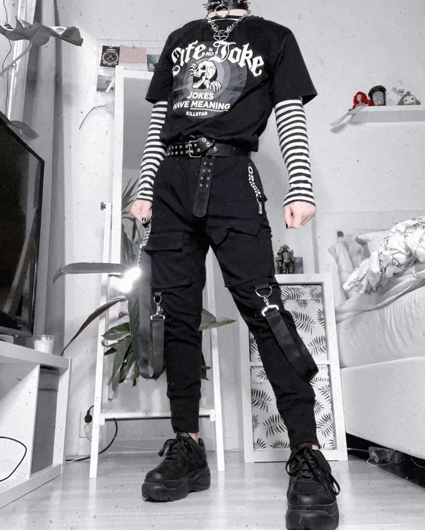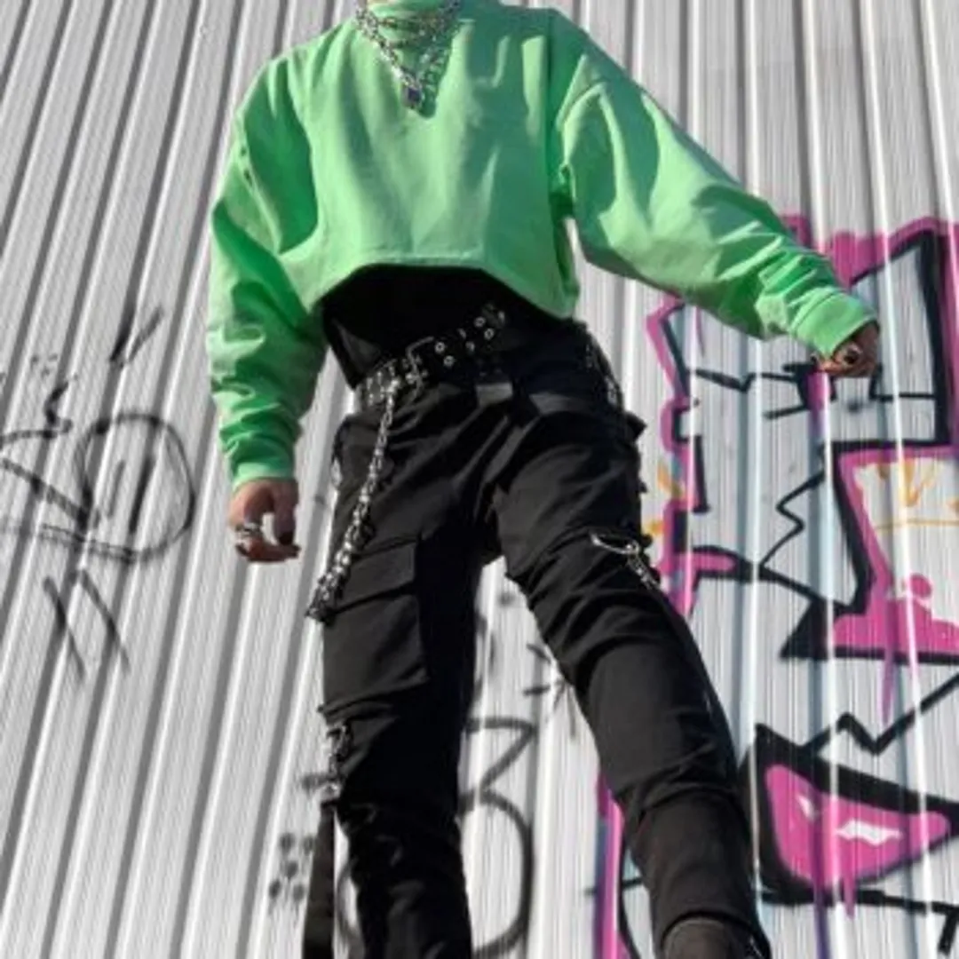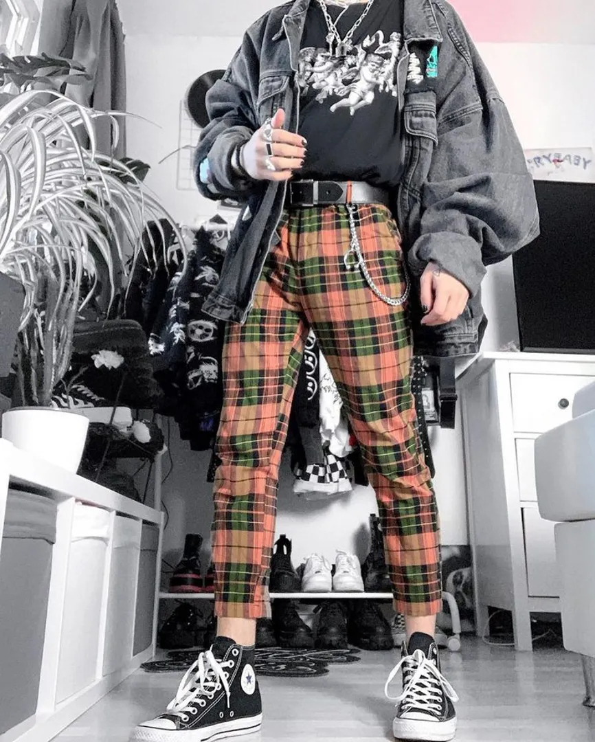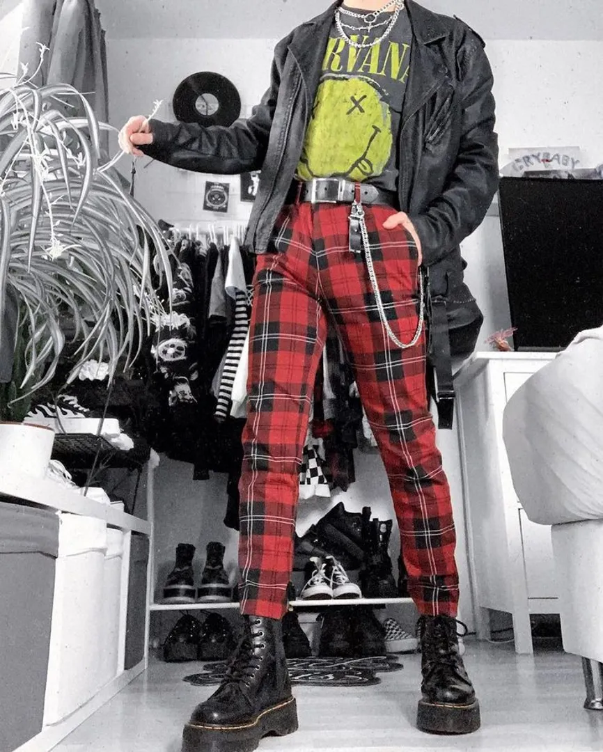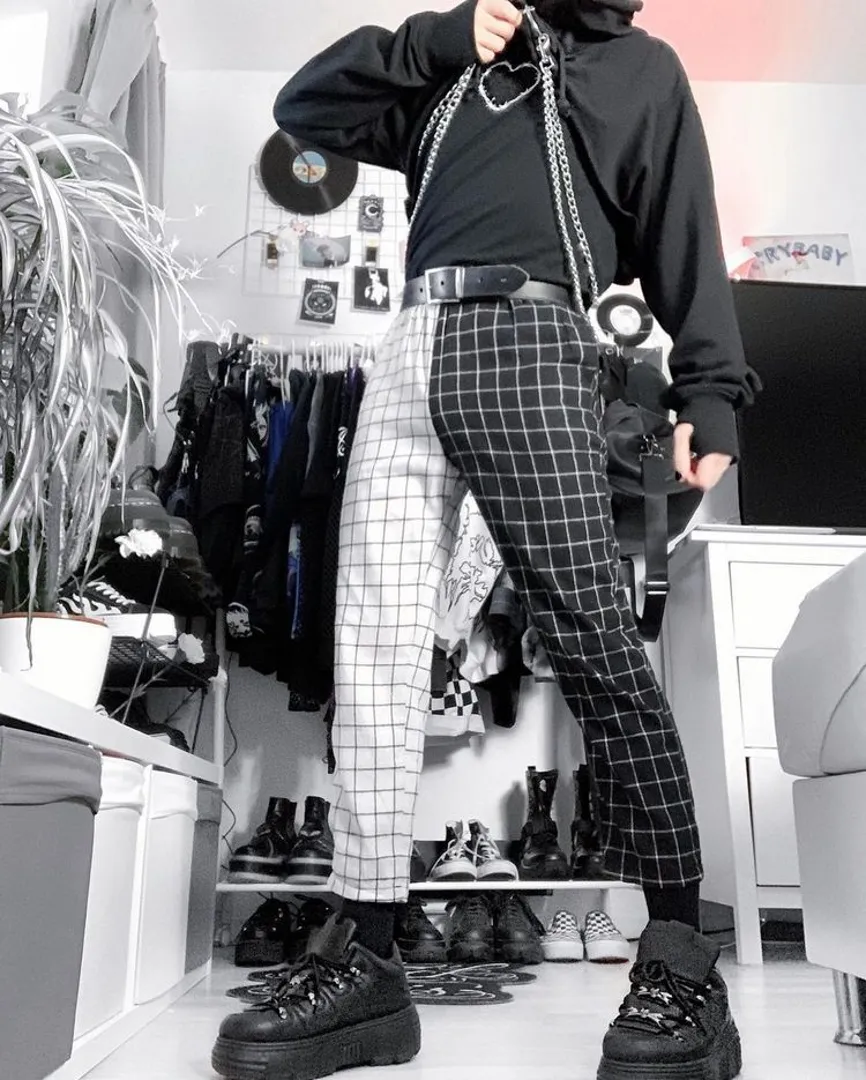 Если вам удастся заполучить брюки в клетку, они тоже могут дополнить образ. Отличным примером стиля субкультуры являются брюки, сшитые вместе из двух разных цветов.