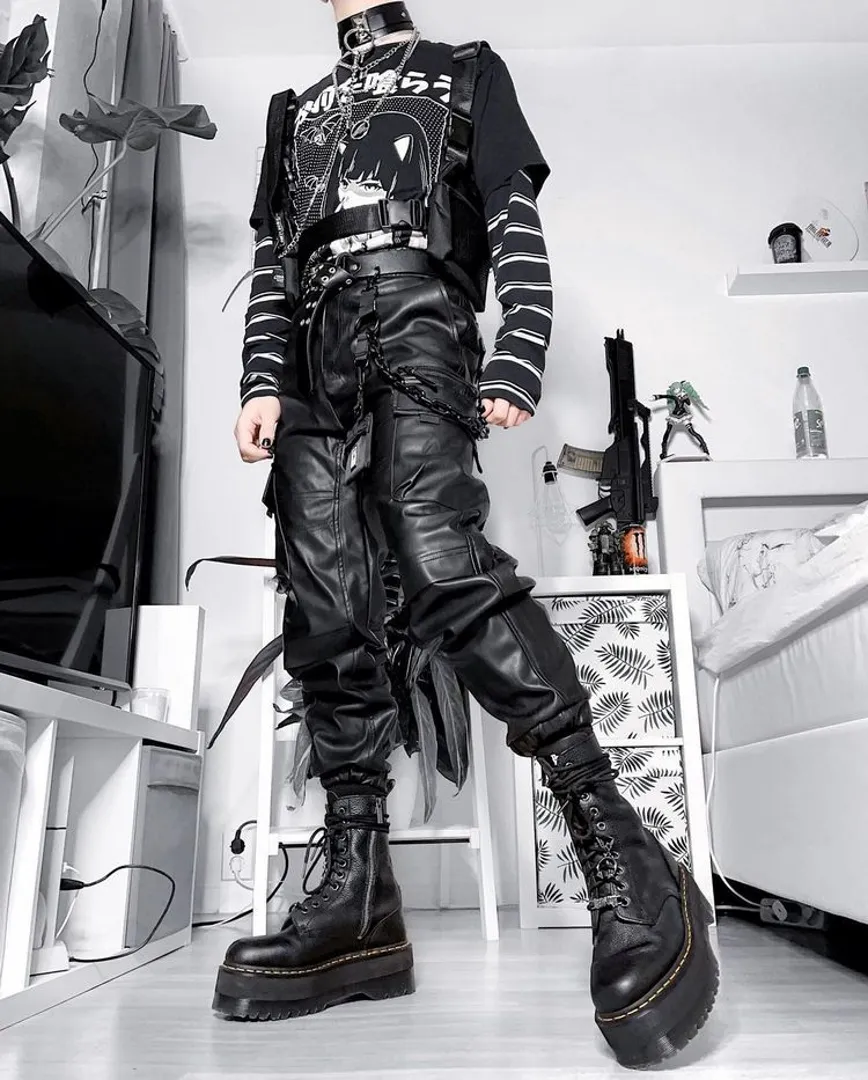 Как брюки в клетку или черные джинсы, кожаные штаны также могут быть украшены английскими булавками, пряжками или цепями по вашему вкусу.