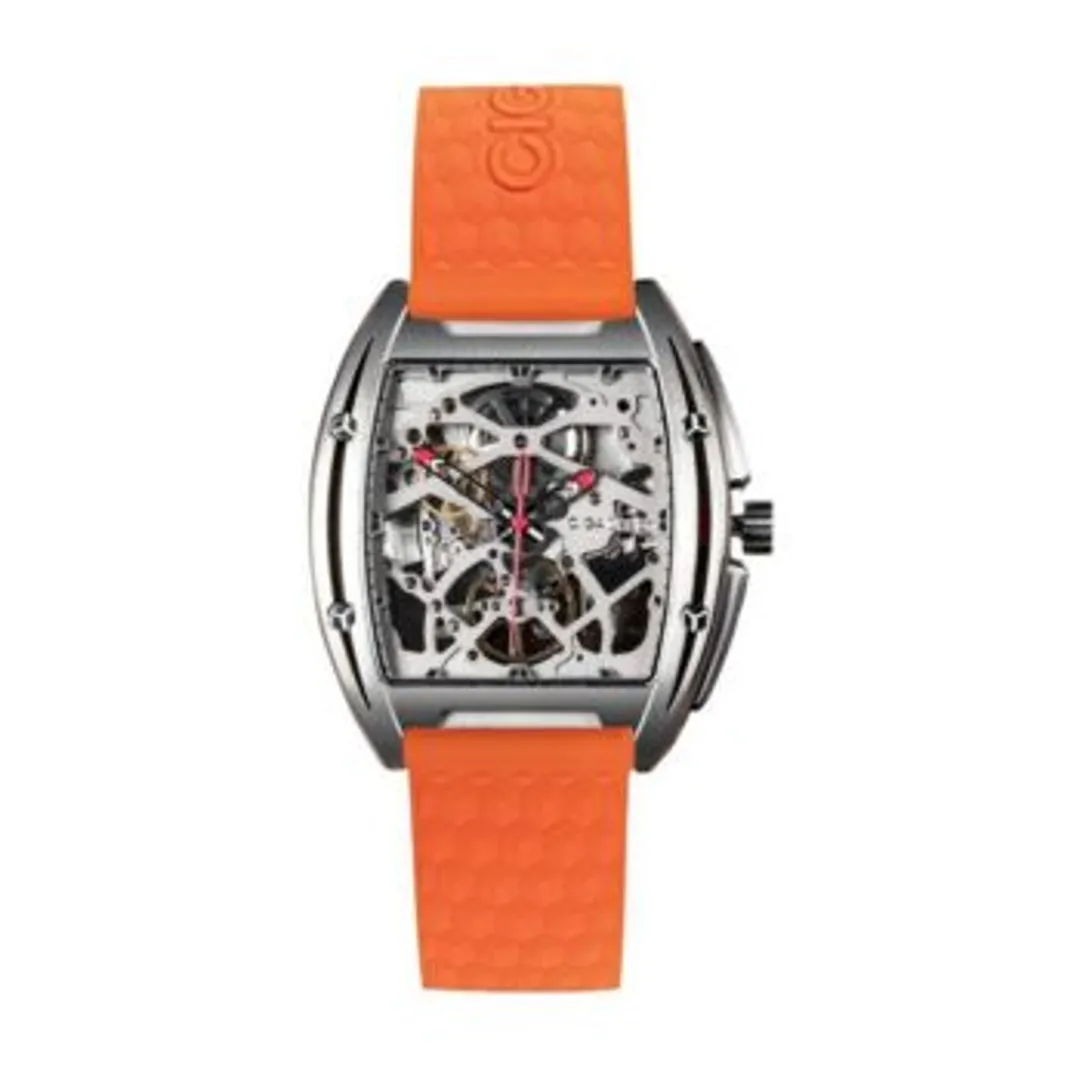 Благодаря форме и соответствующим функциям, механика часов, представляет собой одно из самых точных и сложных изобретений, которые когда-либо знал мир, среди выставленных на всеобщее обозрение. Кроме прочего, на выбор предлагается черный или оранжевый силиконовый ремешок. Мелочь, а приятно.