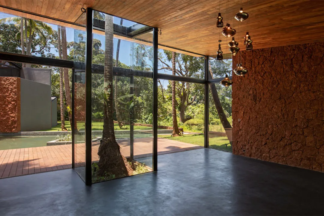На застройку огромной территории (свыше 1300 кв. м.) ушло два года, и архитекторы, стоящие за ним, заявили, что их целью было создать нечто, напоминающее старинную деревню Гоа, но в то же время полностью современное. И этому отлично помогает дерево, застекленное и оставленное расти в гостиной.
