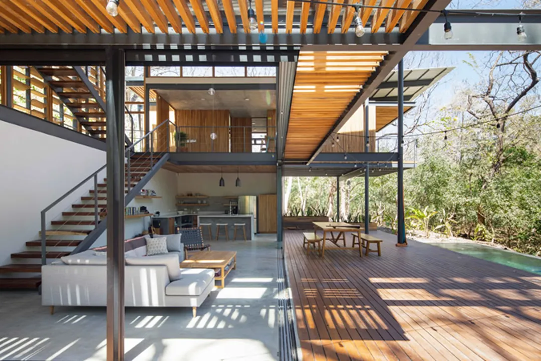 Если каким-то образом, у вас есть небольшой склон в джунглях Коста-Рики, и вы любите там жить. Палатка явно будет ни к месту (100%, вы бы скатились вниз по ручью), поэтому единственное правильное решение – это построить дом со стальным каркасом на сваях, который будет максимально использовать уклон, чтобы открывать вид на верхушки деревьев и небо. Вот немного гениальности в строении: они убрали кондиционеры не только потому, что оно вредно для окружающей среды, но и потому, что они им действительно не нужны, благодаря инновационному дизайну, позволяющему осуществлять перекрестную вентиляцию по всему дому.
