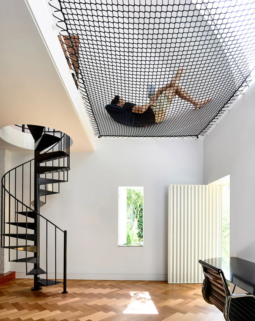 Дизайн основан на капитальном ремонте 170-летнего дома с террасами и вполне возможно, что он единственный в мире дом со встроенным гигантским гамаком.