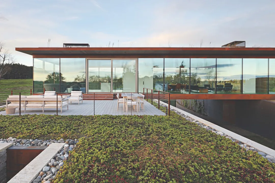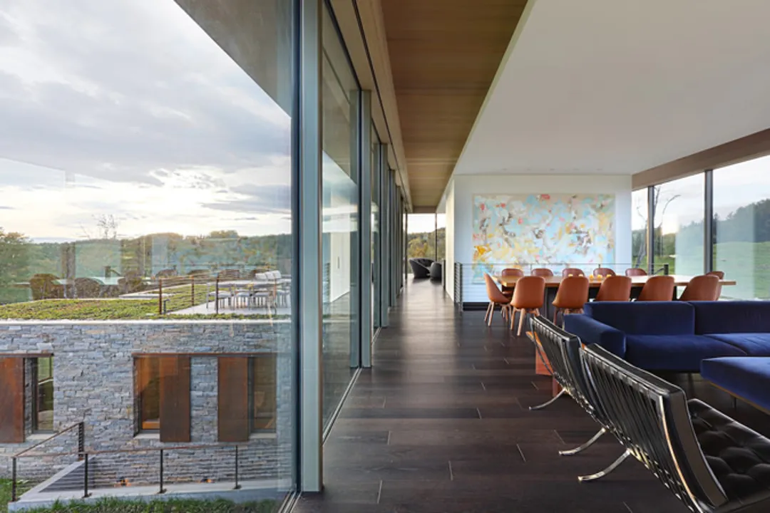 Не только небоскребы в Нью-Йорке бросающие огромные тени на Таймс-сквер способны иметь зеркальные отражения в своих стеклах. Такое же дизайнерское решение было использовано при постройке одноэтажного дома Линк Фарм Хаус который находится на участке в округе Датчесс, в Америке. Нашему дизайнеру нравится тот факт, что он использует (сонную) впадину в ландшафте, которая скрывает половину дома, пока вы не окажетесь практически у входной двери.