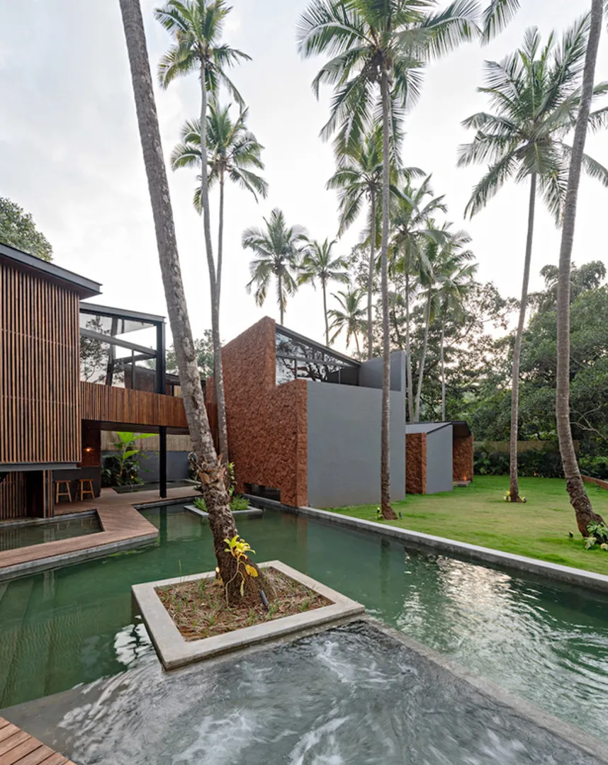 Дом, удостоенный множества наград, расположен в джунглях Гоа и включает бассейны, мосты и крытые палубы с основной инфраструктурой, построенной между деревьями.