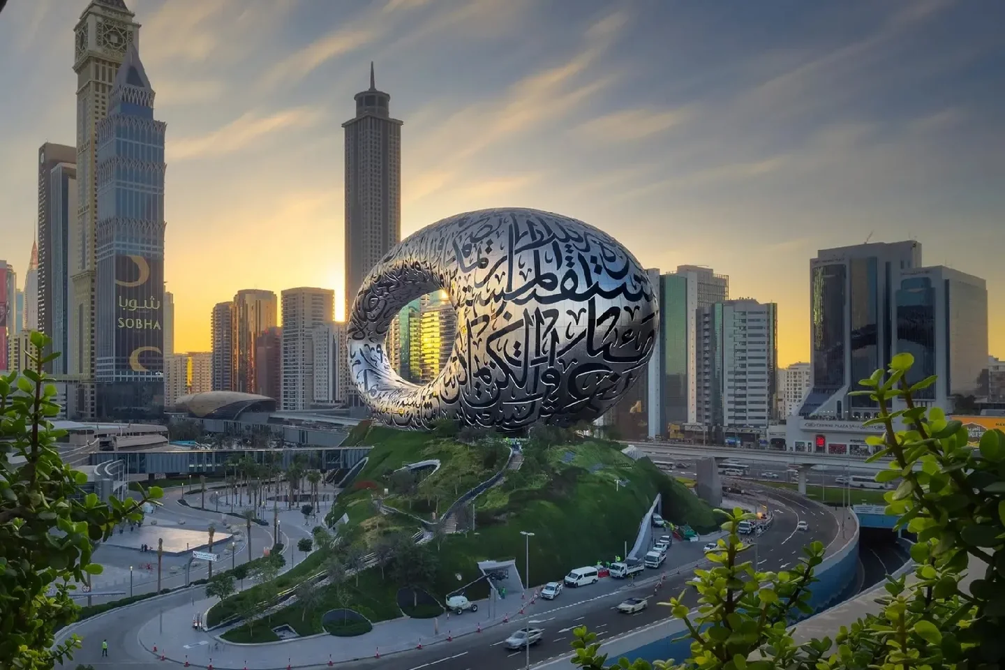 Семь этажей, высота 77 метров, 4 000 мегаватт солнечной энергии для электропитания, эллиптическая пустота, представляющая неизвестность, таким видится будущее, плюс фасад из нержавеющей стали, освещенный 14 000 метров арабской каллиграфии со словами шейха Мохаммеда бин Рашида Аль Мактума «Будущее принадлежит тем, кто может его представить, спроектировать и воплотить в жизнь».