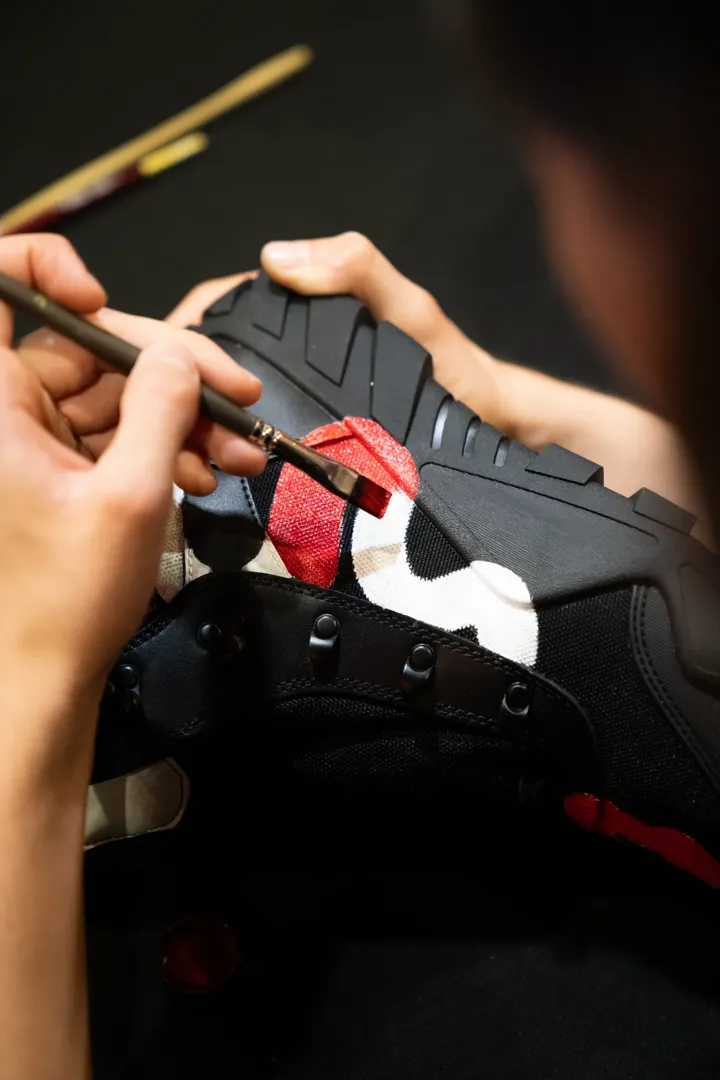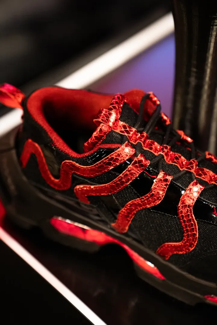 Именно на выставке Sneakerness у нас была возможность пообщаться с ClessioLab, известным как Давиде Паоли, и узнать все подробности, связанные с этим проектом. Прежде всего, Давиде тщательно изучил элементы игры, пытаясь найти нужные детали, которые можно было бы использовать в качестве основы для кастомизации. Вдохновением послужил выбор материалов, использованных в броне одного из персонажей игры, похожей на цепную броню и переосмысленной Давиде в виде черной сетки, характеризующей структуру обуви. Иное дело — люверсы для шнурков: их заменил один из ключевых артов игры, красная змея, — решение, сочетающее эстетику и функциональность.