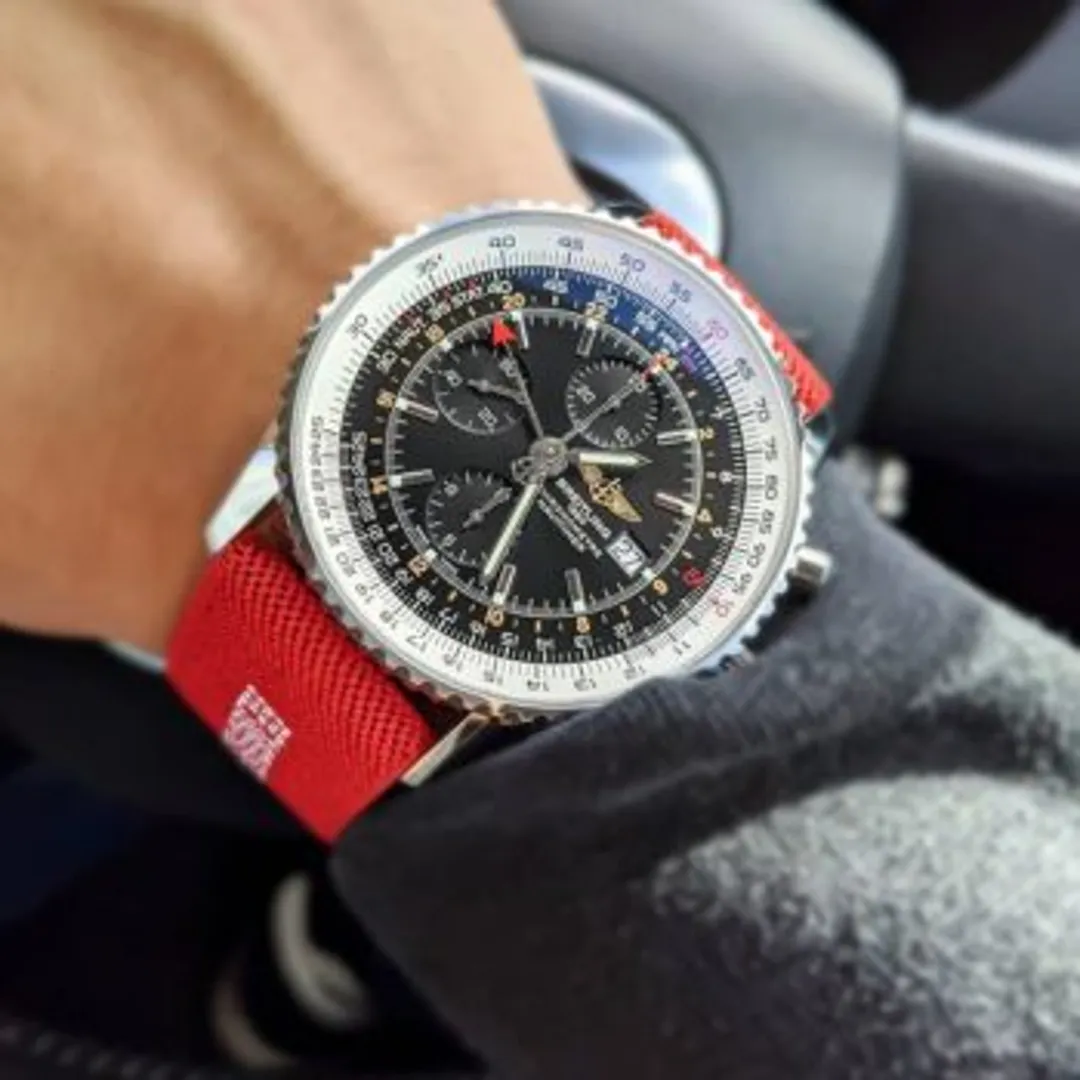 Для тех, кто считает, что стандартного Navitimer недостаточно, вот еще один с добавленной функцией GMT. Очевидно, что 24-часовая шкала времени является идеальным осложнением для реактивного самолета, и она выглядит на этих легендарных часах пилота как пятое колесо. Если держать циферблат блеклым, внимание концентрируется на внешние кольца, а это значит, что, хотя вам, возможно, придется немного щуриться, его не так сложно прочитать.