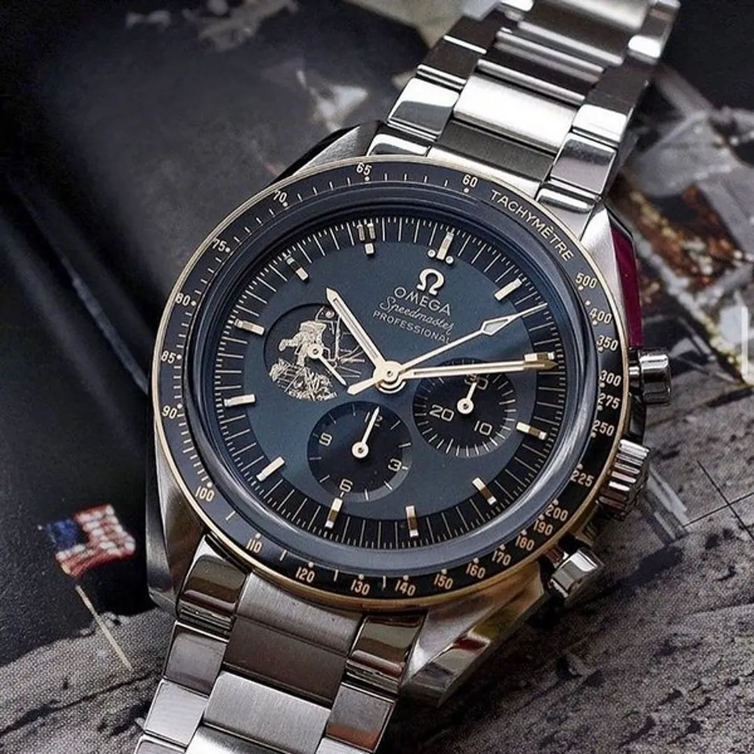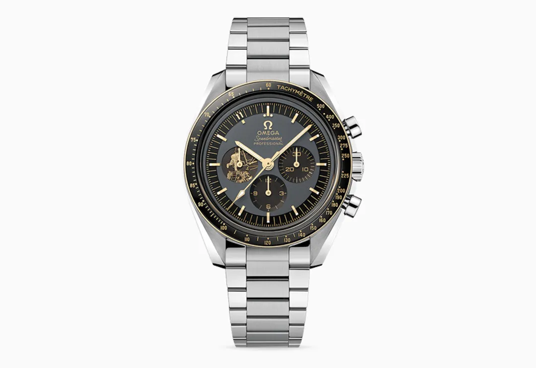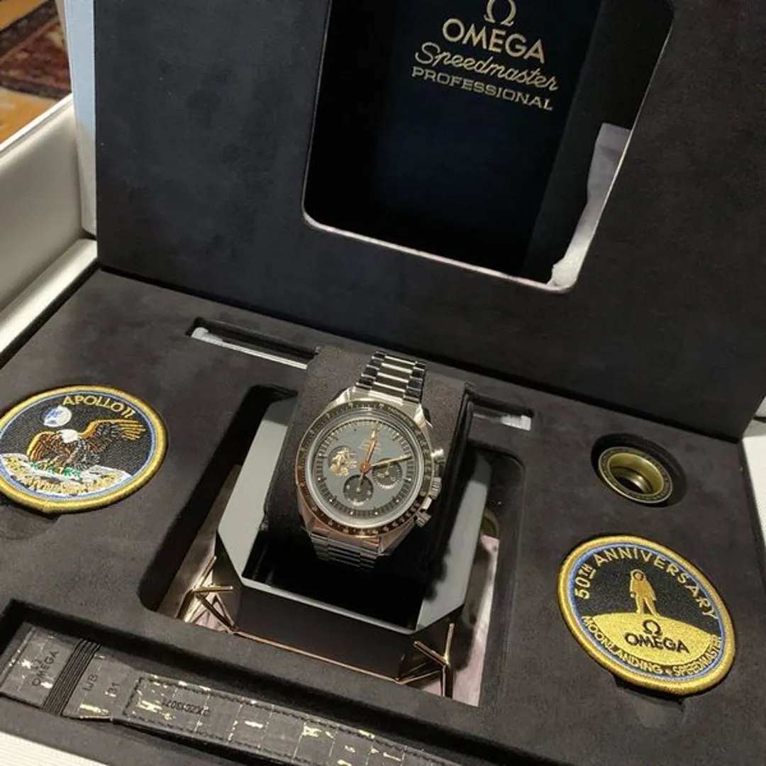Чуть менее ограниченные юбилейные часы выпускаются в виде черного, серого и золотого циферблата Speedmaster. Всего выпущено 6 969 экземпляров часов. На левом вспомогательном циферблате изображена гравюра Базза Олдрина, спускающегося по лестнице Лунного модуля Аполлона на поверхность Луны, а лазерная гравировка следа космонавта украшает заднюю часть корпуса, наряду со знаменитой линией, впервые упомянутой Нилом Армстронгом, когда он приземлился 50 лет назад.
